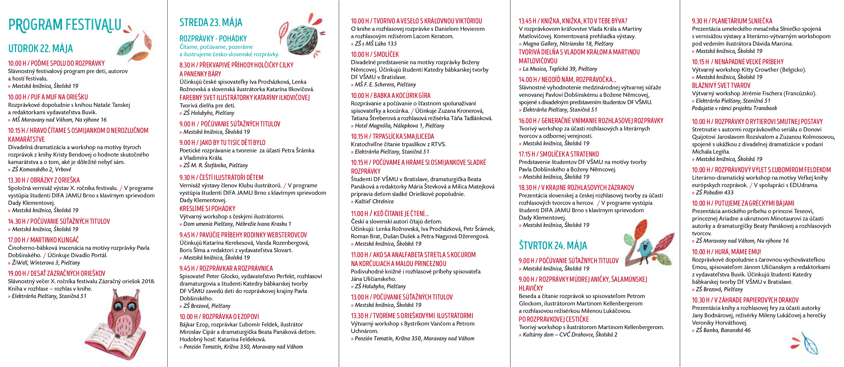 Miesto konania Piešťany (Slovensko) Descripton Mesto Piešťany, Mestská knižnica mesta Piešťany a RTVS organizujú v dňoch 22. – 25. mája 2018 X. ročník festivalu rozhlasových rozprávok ZÁZRAČNÝ ORIEŠOK 2018. Kniha v rozhlase – rozhlas v knihe.