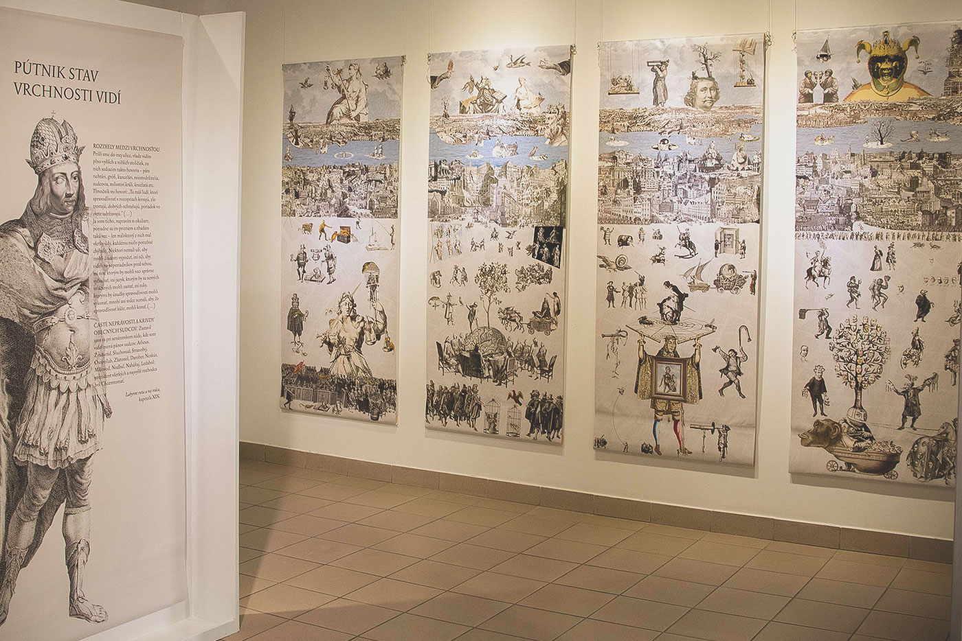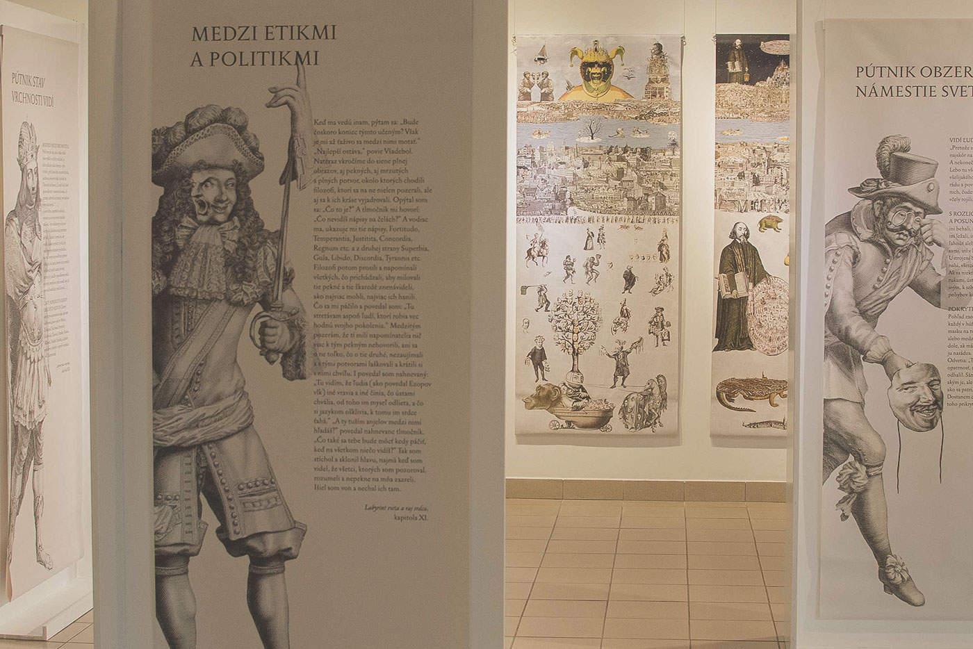 Nemenej dôležitou a silnou je výtvarná časť výstavy v réžii českého výtvarníka a ilustrátora Miroslava Huptycha. „Ako ilustrátora vybraných textov som vybral Miroslava Huptycha z dvoch dôvodov. Po prvé sa Komenského Labyrintom sveta zapodieva už dlho a získal za svoje ilustrácie cenu Magnesia litera v roku 2019, po druhé používa techniku koláže, ktorá alegorickej povahe textu mimoriadne pristane,“ hodnotí svoj výber kurátor Jaroslav Anděl.