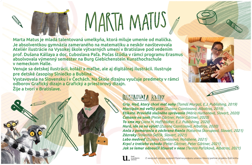 Marta Matus je ilustrátorka a absolventka ateliéru ilustrácie na VŠVU v Bratislave. Počas štúdia absolvovala výmenný semester v nemeckom Halle so zameraním na knižnú väzbu. Venuje sa detskej ilustrácii, koláži a maľbe, ale aj digitálnej ilustrácii alebo komiksu, kreslí pre detské časopisy Slniečko a Bublina.Organizátor Mestská knižnica mesta Piešťany Za podpory Z verejných zdrojov podporil Fond na podporu umenia, ktorý je hlavným partnerom projektu Zaži knihu. WWW adresa NbbaB2vPeIg Súvisiace osobnosti Matus, Marta Súvisiace Mestská knižnica mesta Piešťany