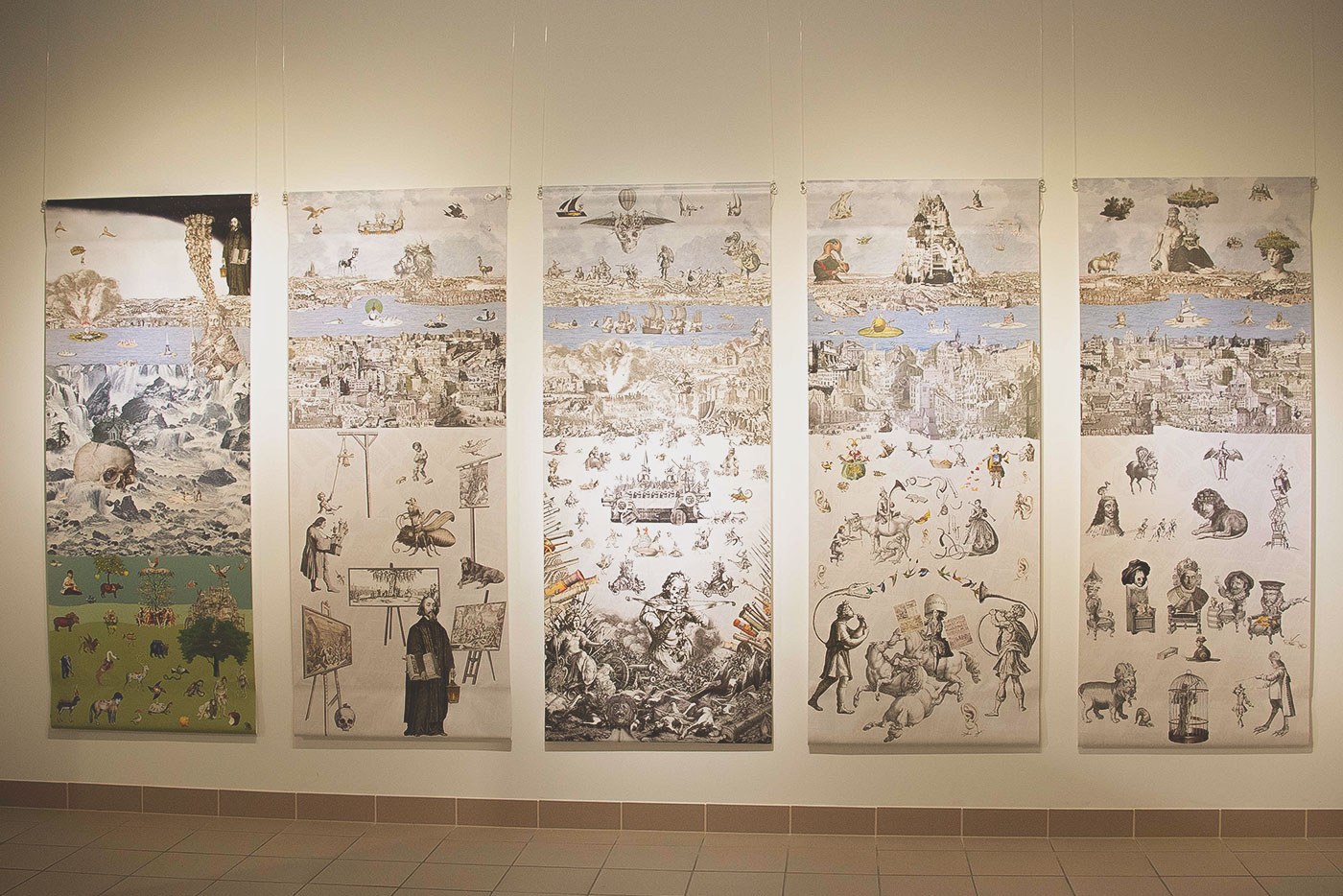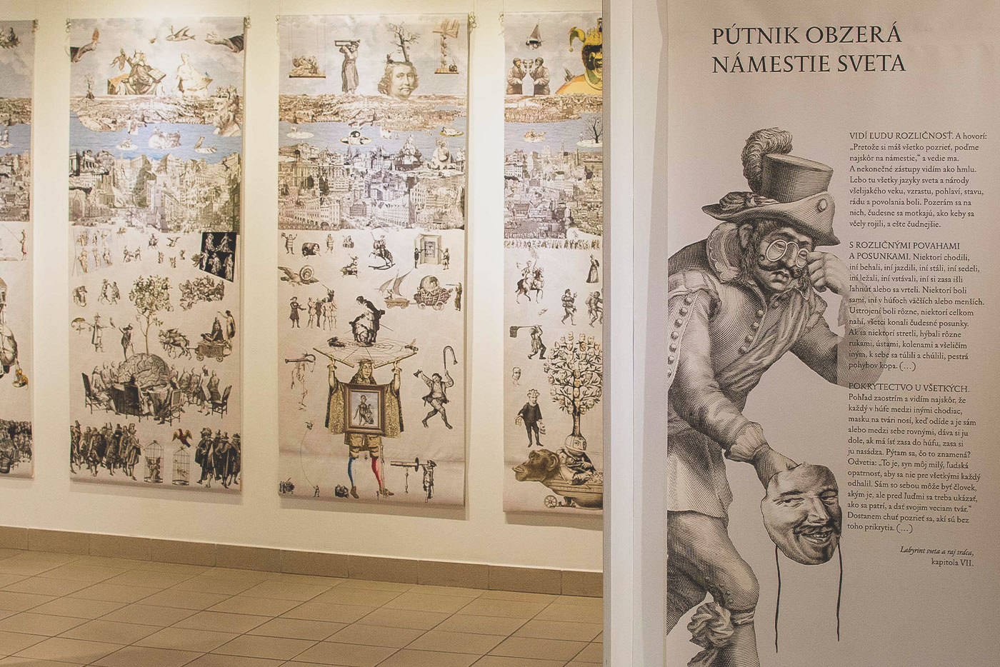 Nemenej dôležitou a silnou je výtvarná časť výstavy v réžii českého výtvarníka a ilustrátora Miroslava Huptycha. „Ako ilustrátora vybraných textov som vybral Miroslava Huptycha z dvoch dôvodov. Po prvé sa Komenského Labyrintom sveta zapodieva už dlho a získal za svoje ilustrácie cenu Magnesia litera v roku 2019, po druhé používa techniku koláže, ktorá alegorickej povahe textu mimoriadne pristane,“ hodnotí svoj výber kurátor Jaroslav Anděl.