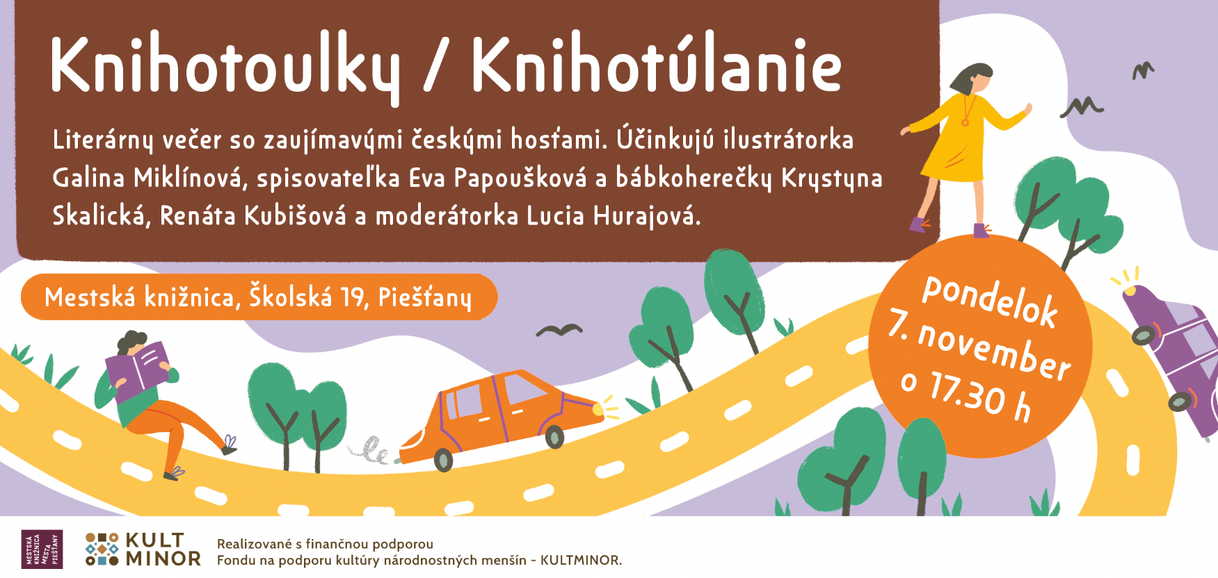 Miesto konania Piešťany (Slovensko) Popis Literárny večer so zaujímavými českými hosťami. Účinkujú ilustrátorka Galina Miklínová, spisovateľka Eva Papoušková a bábkoherečky Krystyna Skalická, Renáta Kubišová a moderátorka Lucia Hurajová. Organizátor Mestská knižnica mesta Piešťany