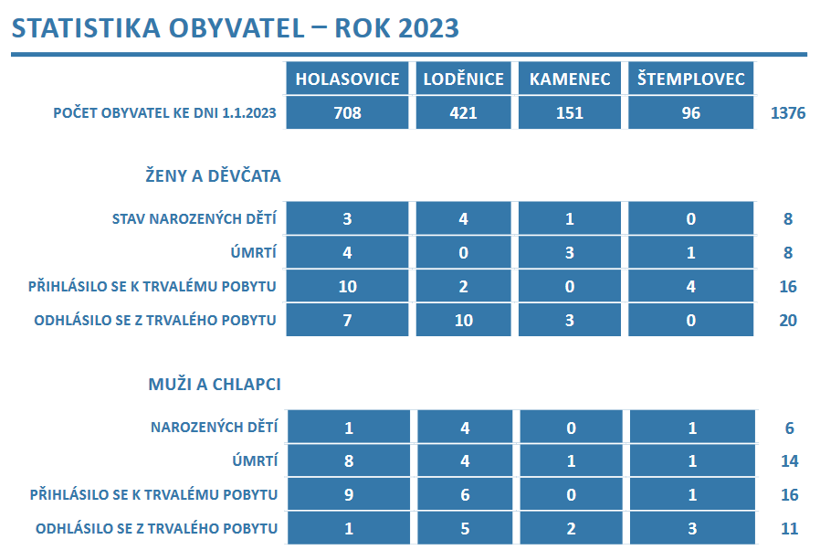 Název Statistika obyvatel - rok 2023 Datum konání 2023 Typ události Obyvatelstvo Klíčová slova obyvatelstvo, statistika O události K 1. lednu 2024 měla naše obec 1 376 obyvatel, z toho Holasovice 708, Loděnice 421, Kamenec 151 a Štemplovec 96 obyvatel. Počet obyvatel se v celé obci oproti loňskému roku opět snížil - o 9 obyvatel; na počátku roku 2023 nás bylo 1 385, na počátku roku 2022 dokonce 1 401. Počet obyvatel se tak v posledních dvou letech začíná postupně vzdalovat od magické hodnoty 1400, kolem které se v předcházejících letech pohyboval. Pokles počtu obyvatel je dán jednak nižším počtem narozených dětí (loni 14, předloni 11) než počtem zemřelých, ačkoliv je tento rozdíl méně dramatický než v roce 2022. Počet přihlášených k trvalému pobytu (32) je o něco nižší než v předchozím roce 2022, přičemž většina přihlášených (19) se přihlásila v Holasovicích. Snížení celkového počtu obyvatel jde dále na vrub vyššímu počtu odhlášených z trvalého pobytu (31 osob), jde však opět o něco nižší hodnotu než v předcházejícím roce 2022, kdy šlo o 37 osob. Počet odhlášených letos jde na úkor zejména Loděnice (15 osob z celkových 31). Zdroj Naše obec - zpravodaj obce Holasovice, číslo 2/2024, strana 4, autoři Lenka Matýsková a Jan Heisig
