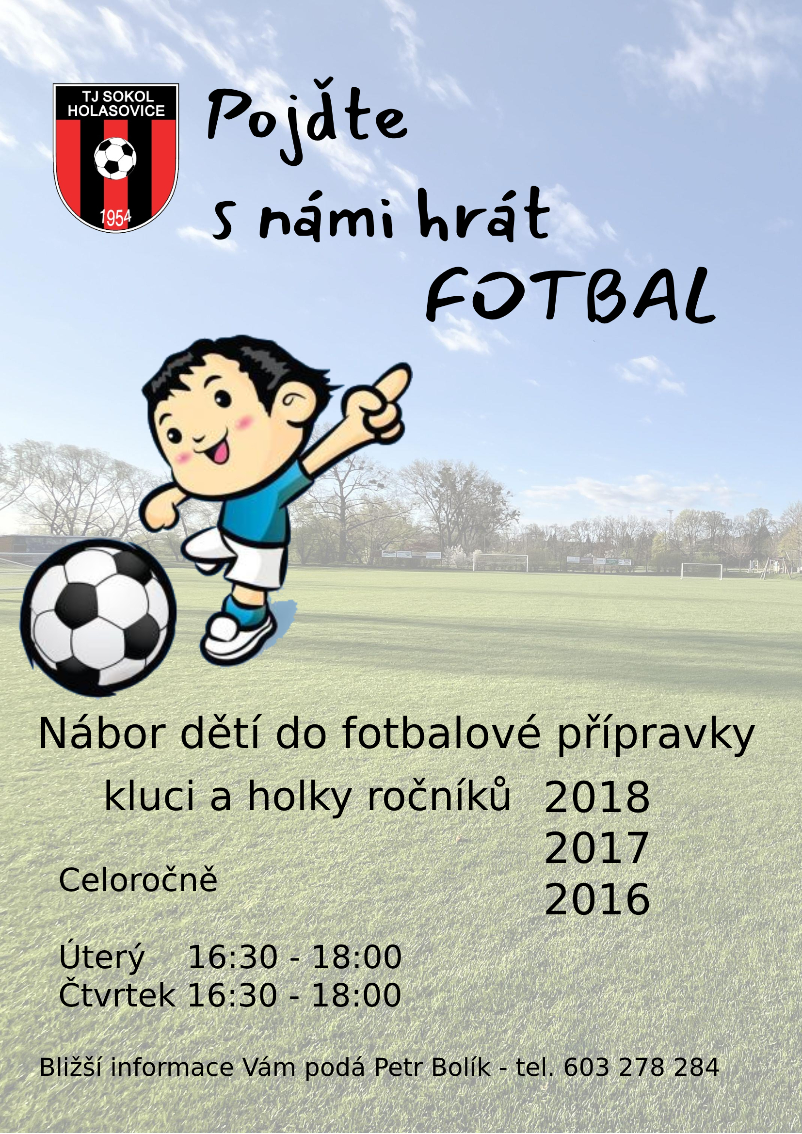 Organizátor Tělovýchovná jednota Sokol Holasovice O události Nábor dětí do fotbalové přípravky. Přihlásit se mohou ročníky 2016 až 2018. Nábor probíhá každé úterý a čtvrtek v době od 16.30 do 18.00 hodin. Pro bližší informace volejte trenéra dětí Petra Bolíka - tel. 603 278 284.