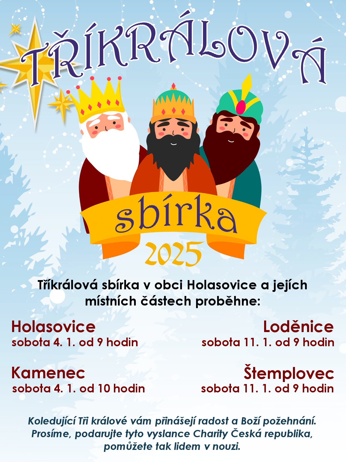 Název Tříkrálová sbírka 2025 Jiný název TKS 2025 Typ události Kultura Klíčová slova charita, sbírka, Tříkrálová sbírka Datum a místo konání 01. 01. 2025 - 14. 01. 2025