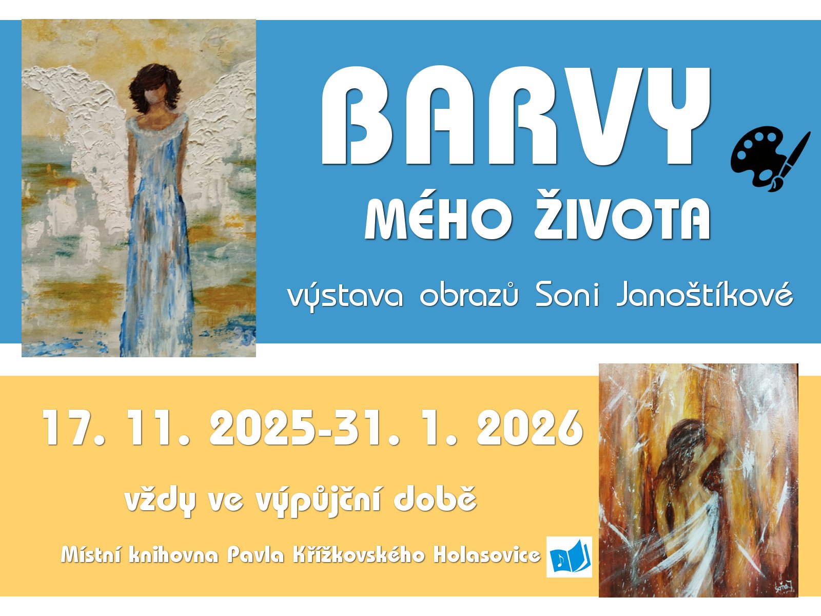 Název Barvy mého života Typ události Kultura Klíčová slova akce pro veřejnost, výstava, obrazy, Místní knihovna Pavla Křížkovského Holasovice Datum a místo konání 17. 11. 2025 - 31. 01. 2026