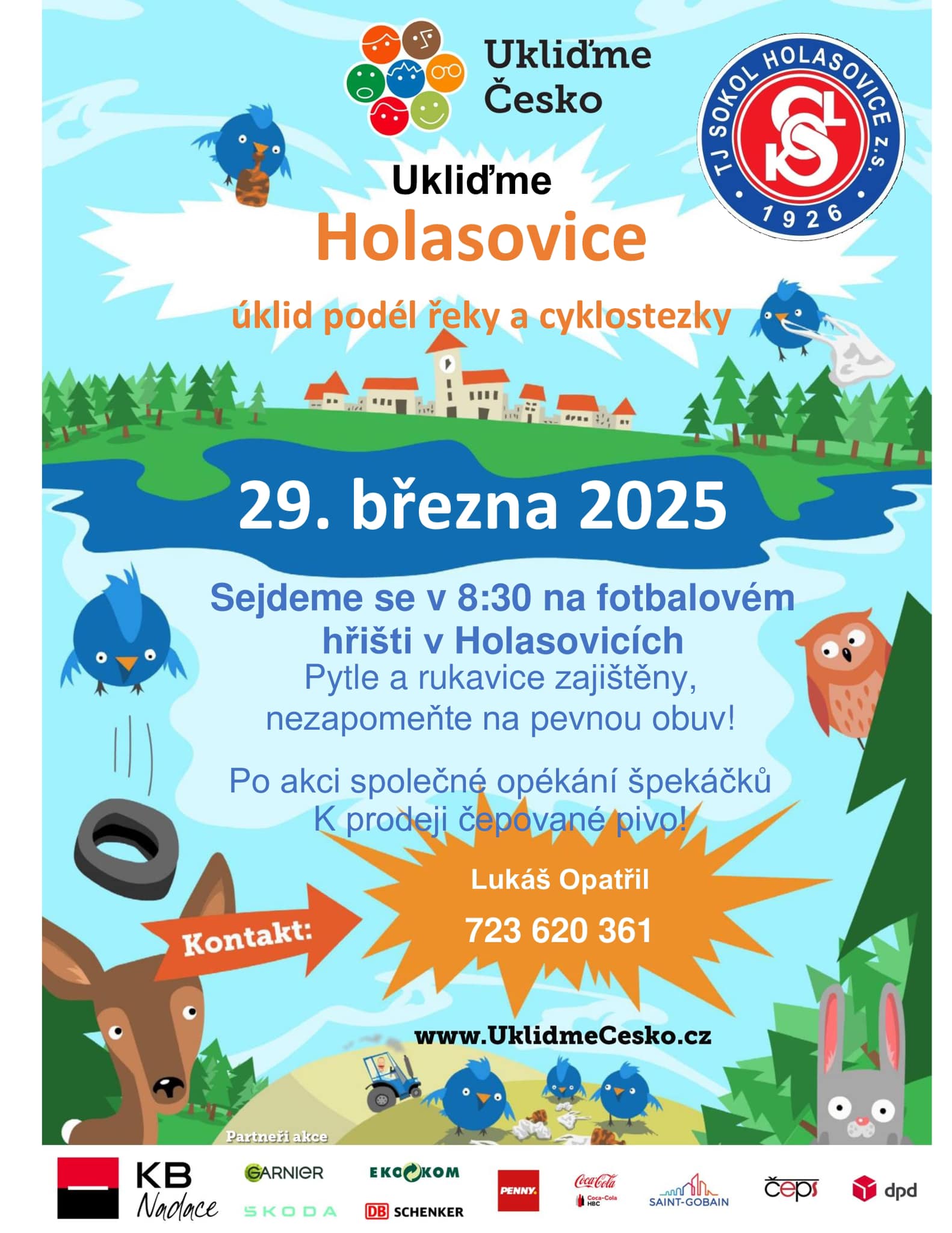 Název Ukliďme Česko - Ukliďme Holasovice Typ události Různé, Spolky a sdružení Klíčová slova akce pro veřejnost, celostátní akce, dobrovolnická akce, úklid venkovních prostor, TJ Sokol Holasovice Datum a místo konání 29. 03. 2025, 08:30 hod. - 29. 03. 2025, 12:00 hod.