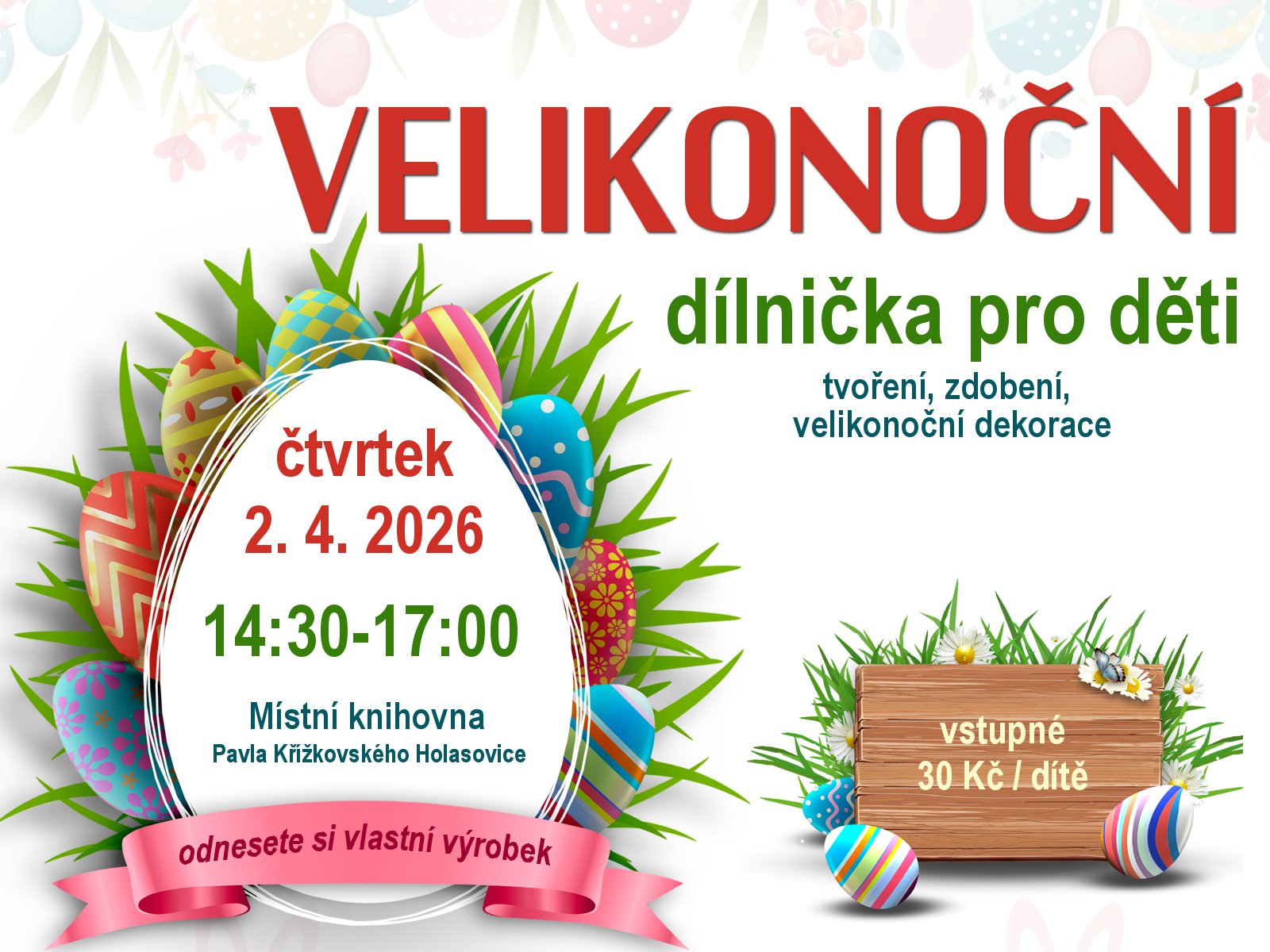 Název Velikonoční dílnička pro děti Typ události Kultura Klíčová slova akce pro děti, výtvarná dílna, Velikonoce, Místní knihovna Pavla Křížkovského Holasovice Datum a místo konání 02. 04. 2026, 14:30 hod. - 02. 04. 2026, 17:00 hod.