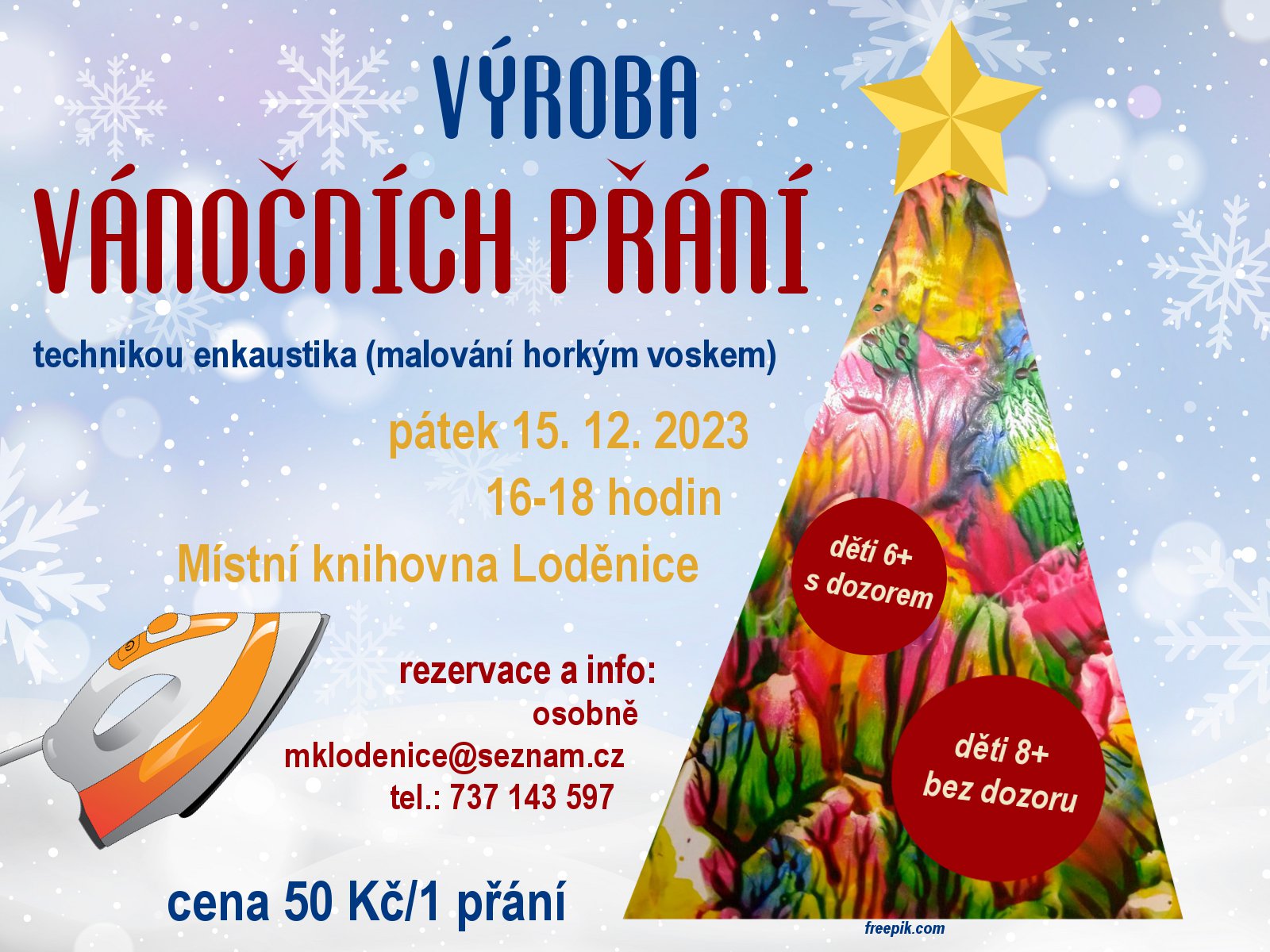 Title Výroba vánočních přání technikou enkaustika Event type Culture Key words akce pro veřejnost, akce pro děti, výtvarná dílna, enkaustika, vánoční přání, Místní knihovna Loděnice Date and place of event 05. 12. 2023, 16:00 hod. - 05. 12. 2023, 18:00 hod.