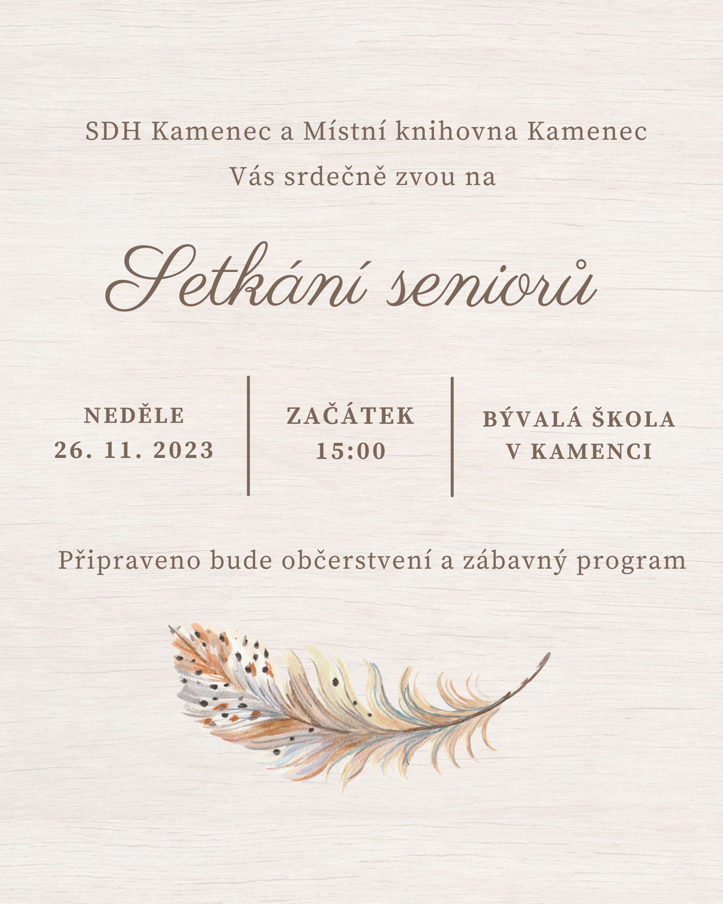 Title Setkání seniorů v Kamenci Event type Culture, Associations Key words akce pro veřejnost, kulturní akce, senioři, Kamenec, SDH Kamenec, Místní knihovna Kamenec Date and place of event 26. 11. 2023, 15:00 hod.