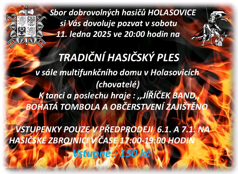 Organizer Sbor dobrovolných hasičů Holasovice About event Tradiční hasičský ples. K tanci a poslechu hraje Jiříček band. Těšit se můžete na přiměřené občerstvení a bohatou tombolu. Vstupenky je možné zakoupit pouze v předprodeji 6. a 7. ledna v hasičské zbrojnici v době od 17 do 19 hodin. Vstupné je 150 Kč.