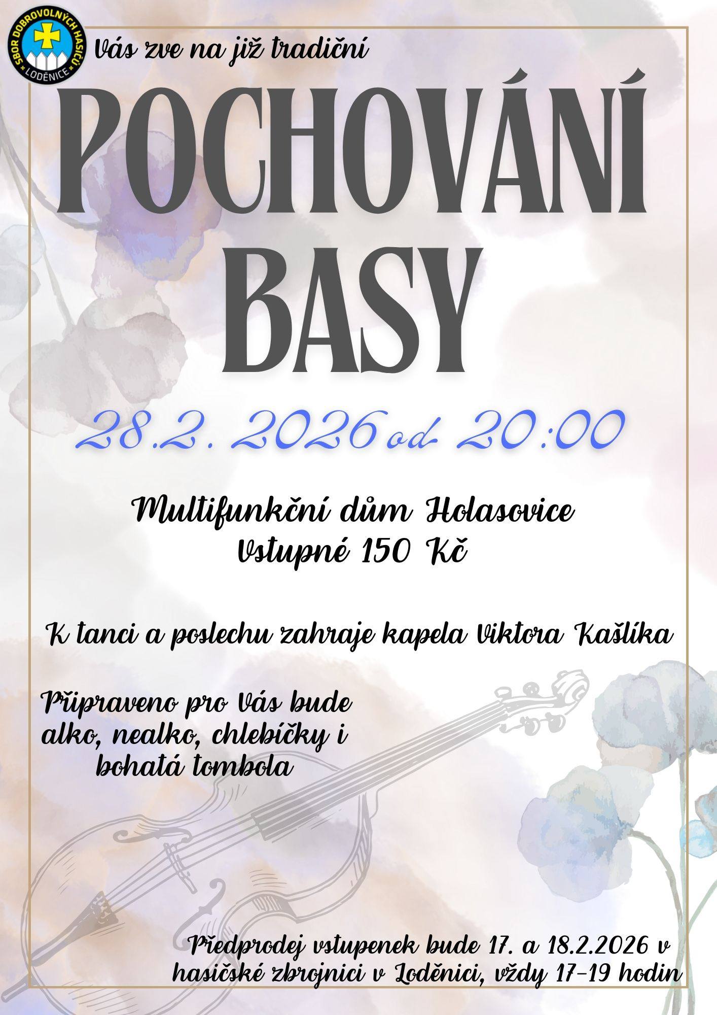 Title Pochování basy Event type Culture Key words akce pro veřejnost, akce pro dospělé, pochování basy, SDH Loděnice Date and place of event 28. 02. 2026, 20:00 hod. - 28. 02. 2026, 23:45 hod.