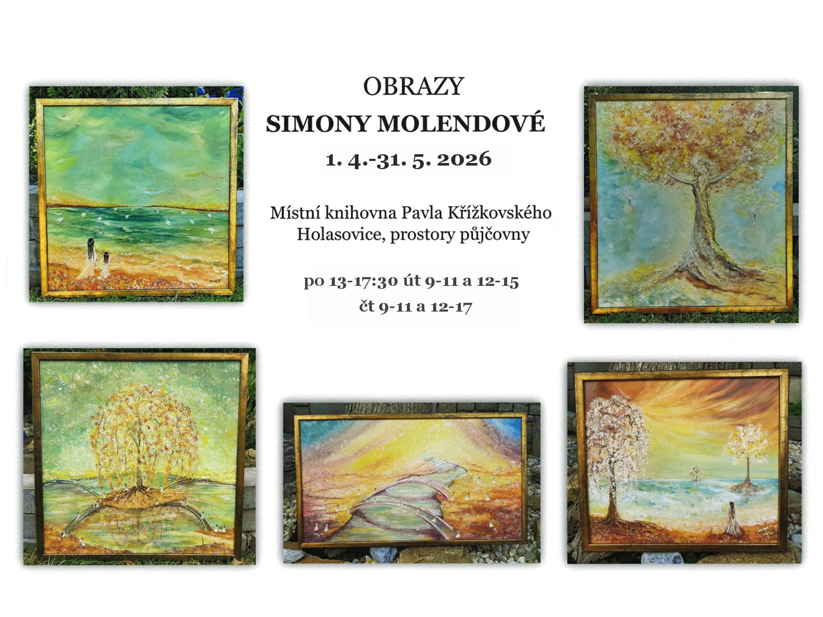 Title Obrazy Simony Molendové Event type Culture Key words akce pro veřejnost, výstava, obrazy, Místní knihovna Pavla Křížkovského Holasovice Date and place of event 01. 04. 2026 - 31. 05. 2026