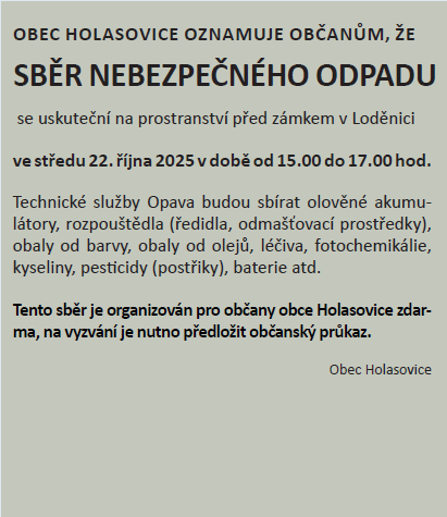 Organizer Obec Holasovice About event Sběr je organizován pro občany obce Holasovice a je zdarma.