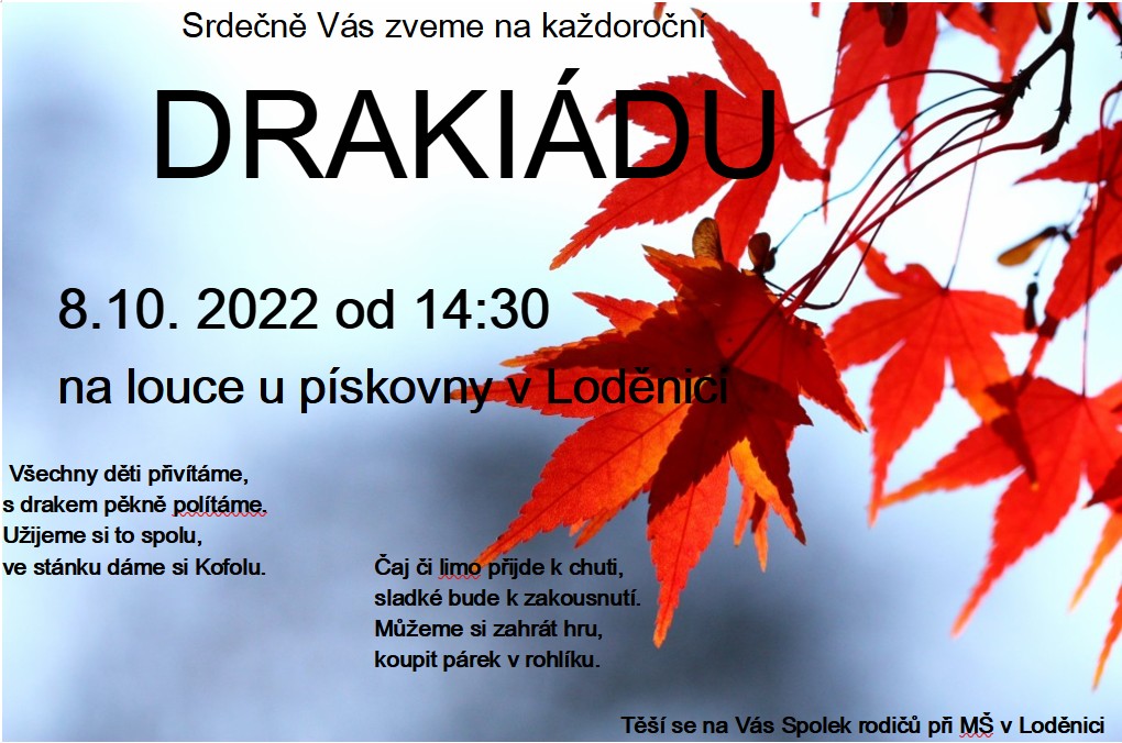 Title Drakiáda Event type Education, Others Key words akce pro veřejnost, akce pro děti, drakiáda, Spolek rodičů při MŠ v Loděnici Date and place of event 08. 10. 2022, 14:30 hod. - 08. 10. 2022, 17:00 hod.