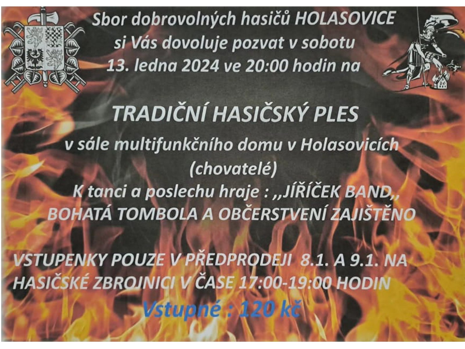 Title Tradiční hasičský ples Event type Culture, Associations Key words akce pro veřejnost, ples, hasičský ples, hasiči, SDH Holasovice Date and place of event 13. 01. 2024, 20:00 hod.