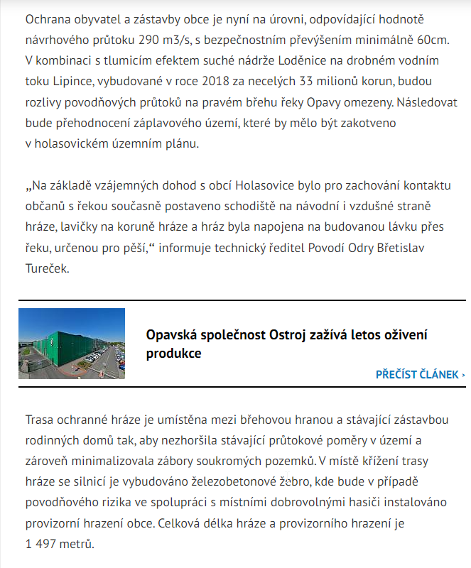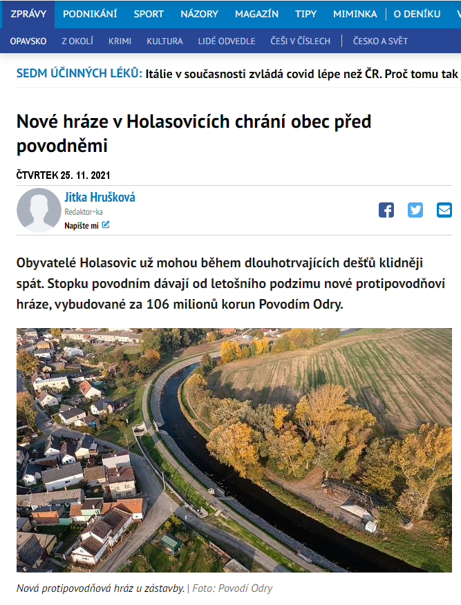Organizer Obec Holasovice Title Nové hráze v Holasovicích chrání obec před povodněmi Event type Public administration and municipality development Event date 2021 Date and place of event 25. 11. 2021 - 25. 11. 2021