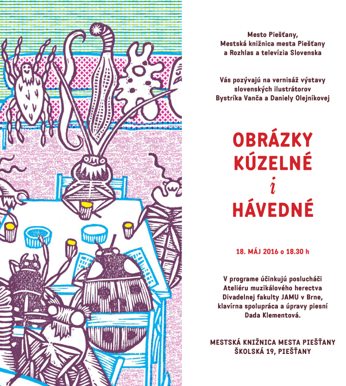 Miesto konania Piešťany (Slovensko) Descripton Vernisáž výstavy významných slovenských ilustrátorov Bystríka Vanču a Daniely Olejníkovej.