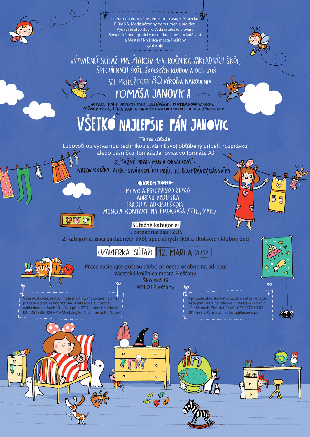 Miesto konania Piešťany (Slovensko) Descripton Výtvarná súťaž pre žiakov základných škôl, špeciálnych škôl a ZUŠ pri príležitosti 80. výročia narodenia spisovateľa Tomáša Janovica. Organizer Mestská knižnica mesta Piešťany Súvisiace osobnosti Janovic, Tomáš References (2) - Podujatie