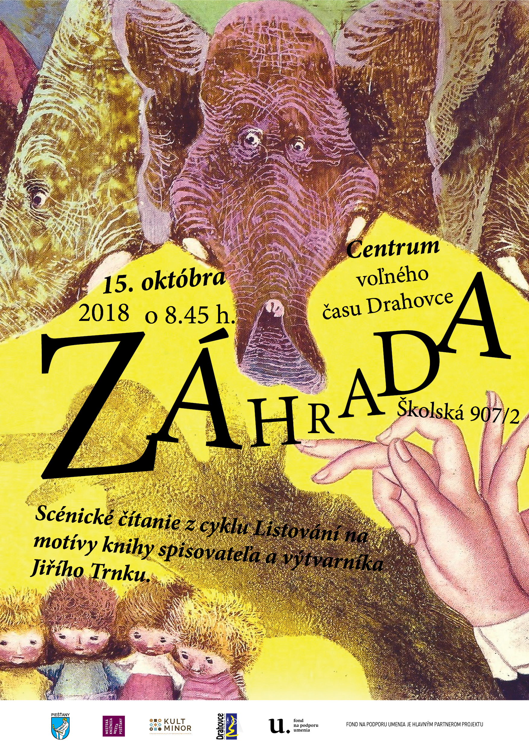 Miesto konania Piešťany (Slovensko) Descripton Scénické čítanie z cyklu Listování na motívy knihy spisovateľa a výtvarníka Jiřího Trnku. Organizer Mestská knižnica mesta Piešťany Súvisiace osobnosti Trnka, Jiří References (1) - Podujatie