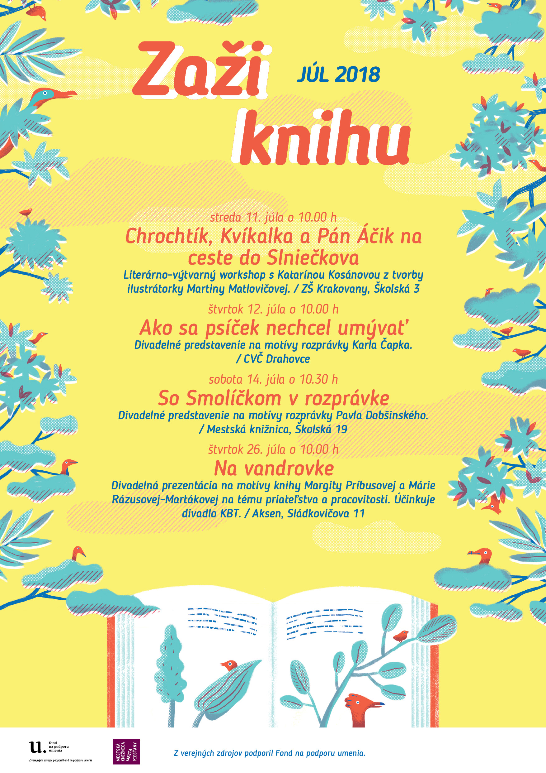 Miesto konania Piešťany (Slovensko) Descripton Projekt Zaži knihu nadvazuje na dlhoročnú tradíciu medzinárodných aktivít piešťanskej knižnice, ktoré si kladú za cieľ rozvíjať čítanie, podporovať vzdelanosť, prezentovať a propagovať literatúru pre deti rozmanitými a inovatívnymi formami, príťažlivými pre dnešné dieťa. Náš projekt má zároveň ambíciu prezentovať slovenských a českých tvorcov (spisovateľov, ilustrátorov, vydavateľov, animátorov, hercov) a predstaviť tak pozitívne okamihy a udalosti posledných 100 rokov s dôrazom na spoločnú históriu oboch národov. Naša knižnica tak prispeje k oslavám významných historických výročí v roku 2018 (100. výročie vzniku Československej republiky). Prostredníctvom kultúrnych, umeleckých a odborných aktivít chceme prezentovať české a slovenské umenie pre deti s cieľom oboznámiť mladú generáciu s obsahom nášho spoločného kultúrneho dedičstva a zvýšiť povedomie o dôležitosti rozvíjania a upevňovania vzájomných česko-slovenských vzťahov. Aktivity projektu: čítania z tvorby českých a slovenských autorov, divadelné prezentácie, výstavy českých a slovenských ilustrátorov, komponované literárne programy a workshopy, túlavý antikvariát, divadelné predstavenia, seminár zameraný na prezentáciu tvorivých aktivít slovenských a českých knižníc. Českú a slovenskú literárnu tvorbu budeme prezentovať v rôznych podobách – literárnej, výtvarnej, divadelnej, rozhlasovej i animovanej.