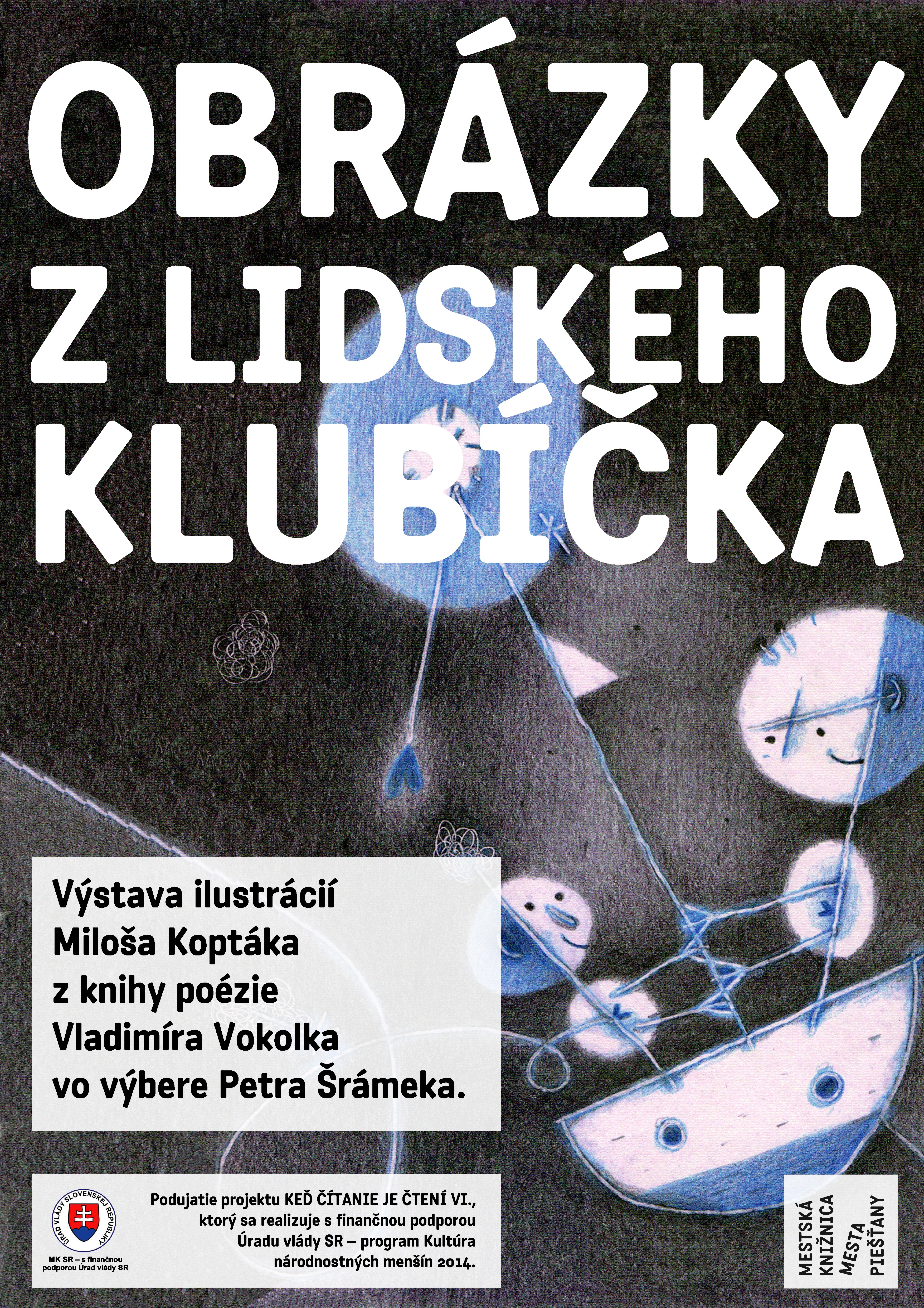Miesto konania Piešťany (Slovensko) Popis Výstava ilustrácií Miloša Koptáka z knihy poézie Vladimíra Vokolka vo výbere Petra Šrámeka. Organizátor Mestská knižnica mesta Piešťany Odkazy (1) - Podujatie