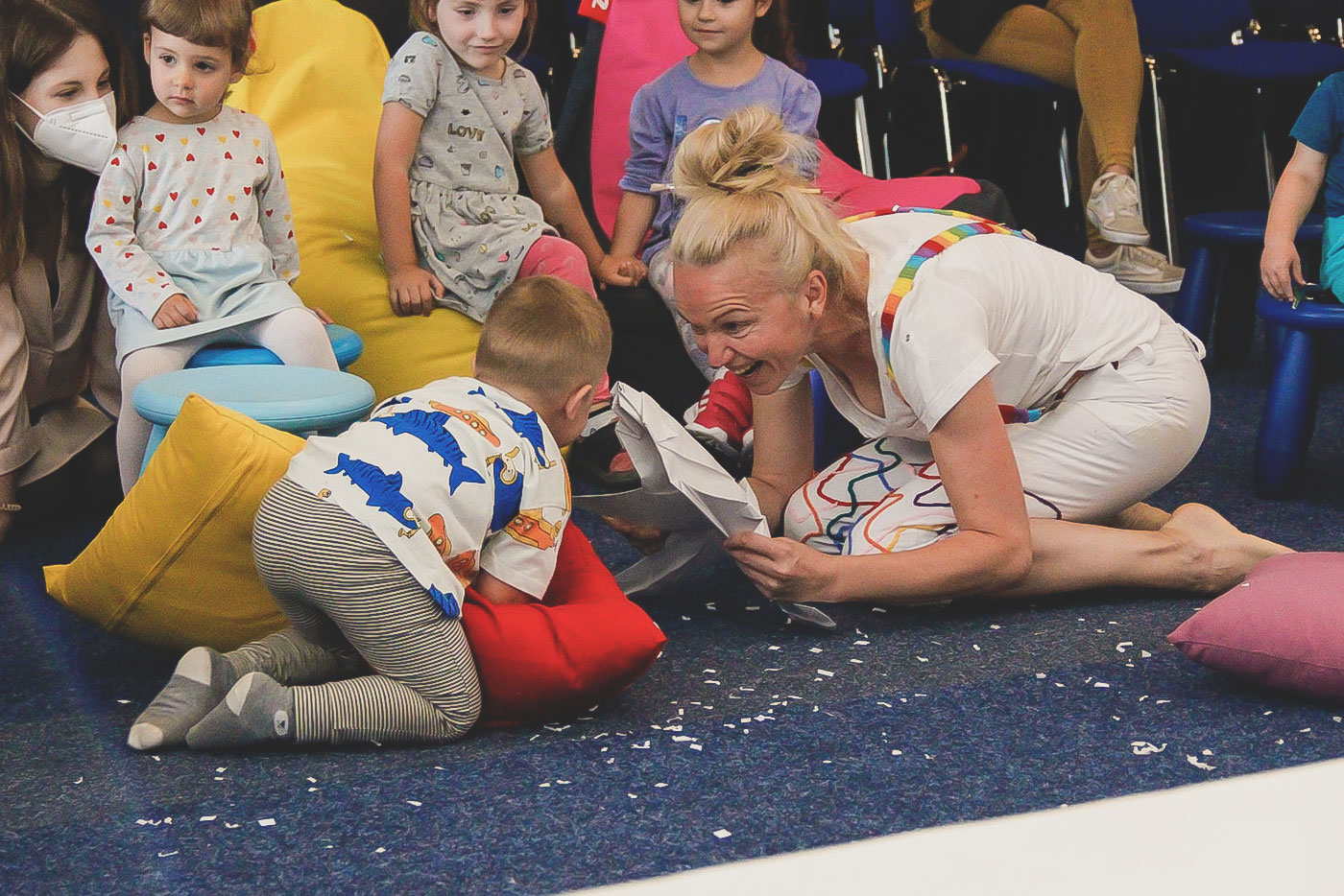 Počas predstavenia je dovolené hýbať sa, dotýkať sa, skúmať, smiať sa aj plakať. Cieľom projektu je prehĺbiť kontakt rodiča a dieťaťa, motivovať a inšpirovať dospelého človeka k väčšej hravosti a batoľatám sprostredkovať prvý kontakt s farbami.Organizátor Mestská knižnica mesta Piešťany Za podpory Z verejných zdrojov podporil Fond na podporu umenia, ktorý je hlavným partnerom projektu Poď z ulice do knižnice VI. Súvisiace Mestská knižnica mesta Piešťany