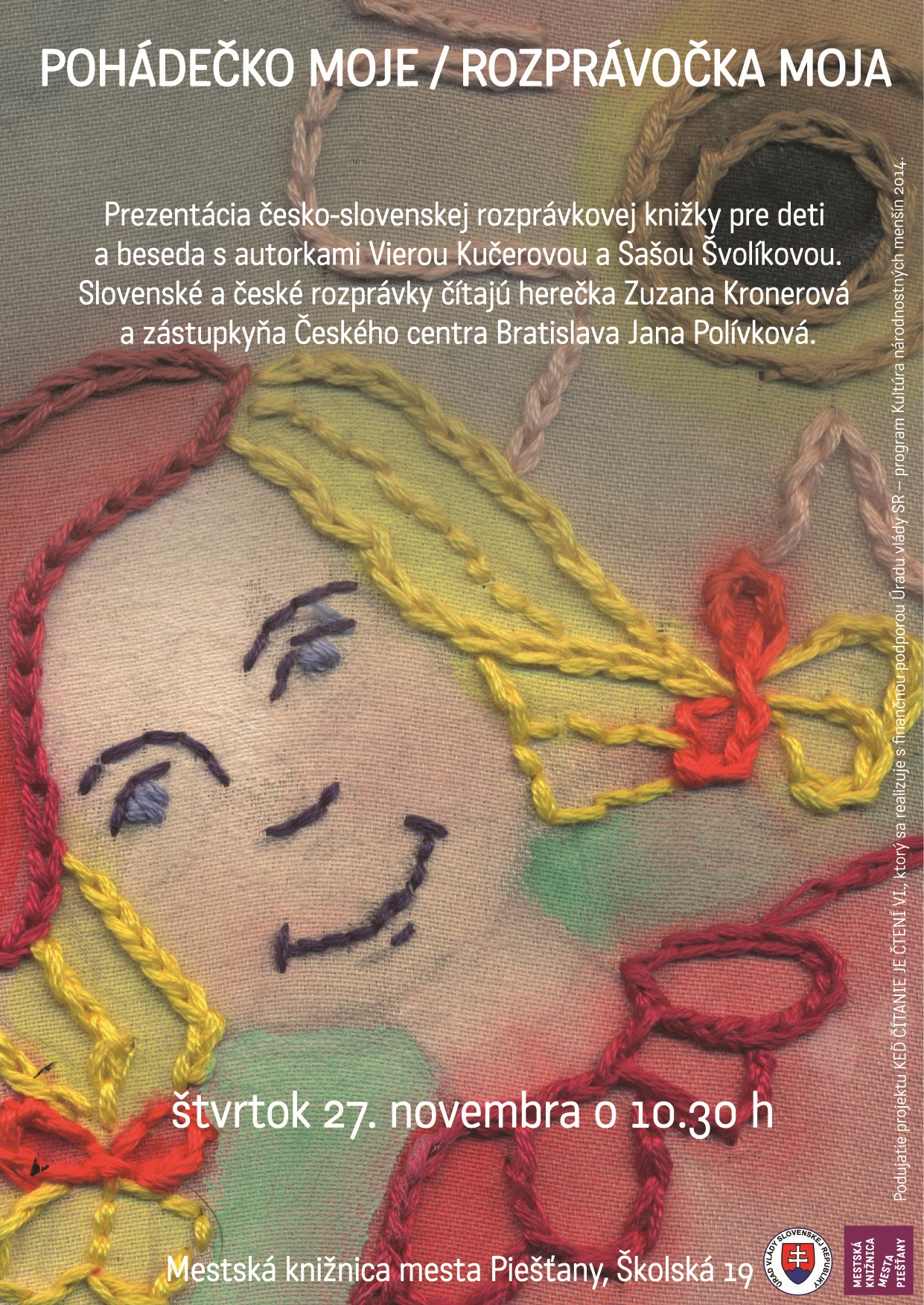 Miesto konania Piešťany (Slovensko) Popis Prezentácia česko-slovenskej rozprávkovej knižky pre deti a beseda s autorkami Vierou Kučerovou a Sašou Švolíkovou. Slovenské rozprávky číta herečka Zuzana Kronerová, české zástupkyňa Českého centra Bratislava Jana Polívková. Organizátor Mestská knižnica mesta Piešťany Súvisiace osobnosti Kronerová, Zuzana