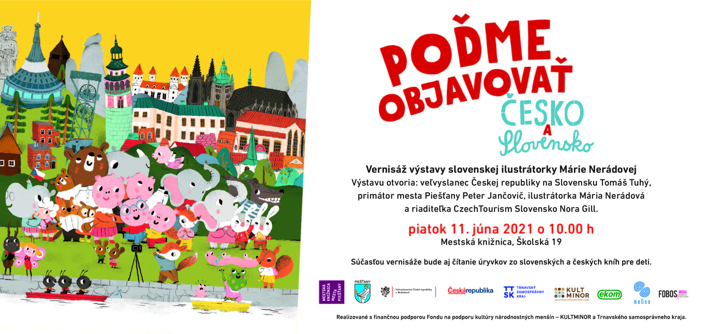 Miesto konania Piešťany (Slovensko) Popis Vernisáž výstavy veľkoplošných ilustrácií Márie Nerádovej z kníh Pojďme objevovat Česko a Poďme objavovať Slovensko.