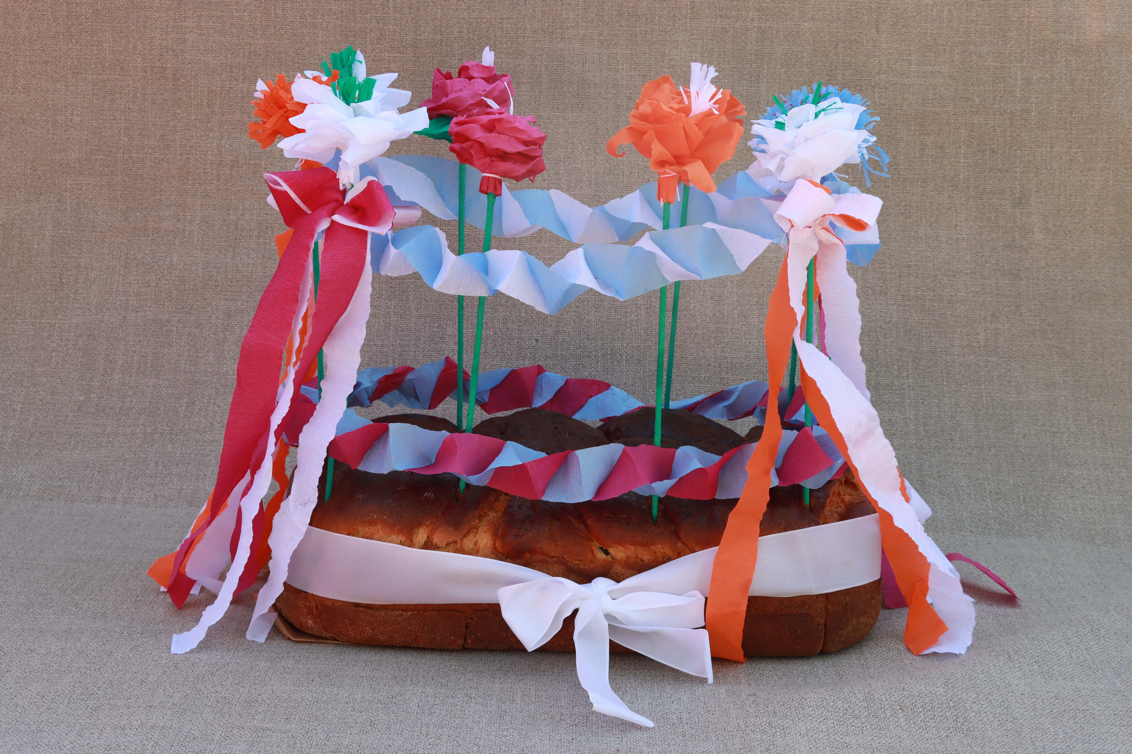 General description Svadobný koláč bol upečený a zdokumentovaný pri príprave projektu Svadobné obradové koláče. Výskumný tím tvorili Andrea Jágerová, Marcela Černáková a Lukáš Hronček. Koláč pri tejto príležitosti upiekli Mária Celengová a Anna Balážová. Jeho veľkosť prispôsobili rozmerom rúry na pečenie. Note celkový pohľad na svadobný koláč Municipality of origin Príbelce, okres Veľký Krtíš Recorded by Hronček, Lukáš (2000) Other responsibility Jágerová, Andrea (autor/-ka pasportizačných údajov)