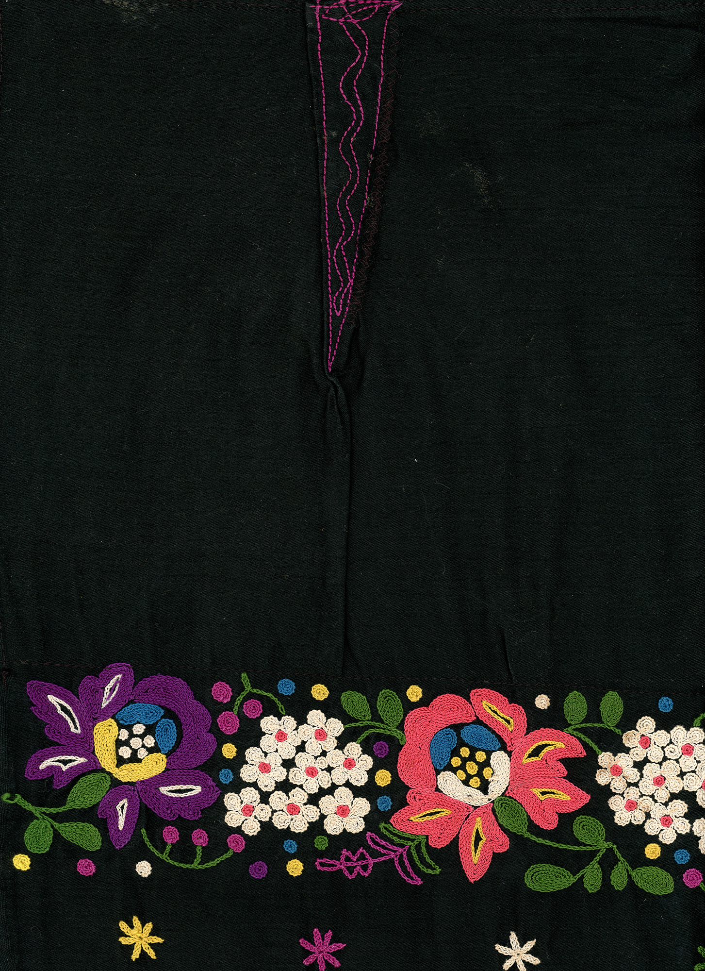 Descripton Mužská zástera z čierneho glotu je ušitá z jedného dielu látky. Šírka zástery je 67 cm, dĺžka 68 cm, strapce majú dĺžku 1 cm. Zásteru zdobí štepovanie strojom, výšivka „krivou ihlou“ a „krepindľa“ – ozdobná stuha našitá 10 cm od spodného okraja. Note detailný pohľad Work owner Sebíň, Štefan (1986) Date of creation 30. roky 20. storočia Municipality of origin Korytárky, okres Detva Recorded by Hronček, Lukáš (2000) Other responsibility Hronček, Lukáš (digitalizoval/-a)