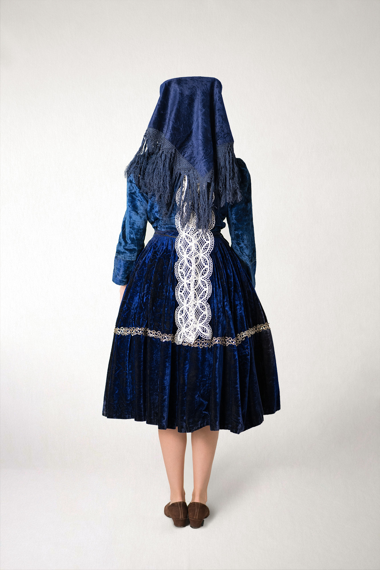 Vrchná sukňa zhotovená z plyšu je zdobená našitou „krepindľou“ – prámikom. Pod vrchnú sukňu sa obliekali dve až tri spodné plátenné sukne. Plyšová blúza so sedlovým strihom a s nabratými rukávmi sa vzadu zapína na malý gombík. Spodný odev tvorí plátenná košieľka bez rukávov, ktorá siaha po kolená. Doplnkom odevu je háčkovaná „kápka“ – čepiec vyšívaný korálikmi a „pľiška“ – plyšová šatka s hodvábnymi strapcami. „Šnúrka“, ktorá sa uväzovala na zátylku čepca, je vyšitá „krivou ihlou“ a vyrezávaná. Žena má obuté semišové poltopánky.Note celkový pohľad zozadu Work owner Kucbeľová, Jana (1963) Date of creation 50. roky 20. storočia Municipality of origin Detva, okres Detva Recorded by Hronček, Lukáš (2000) Other responsibility Hronček, Lukáš (digitalizoval/-a)