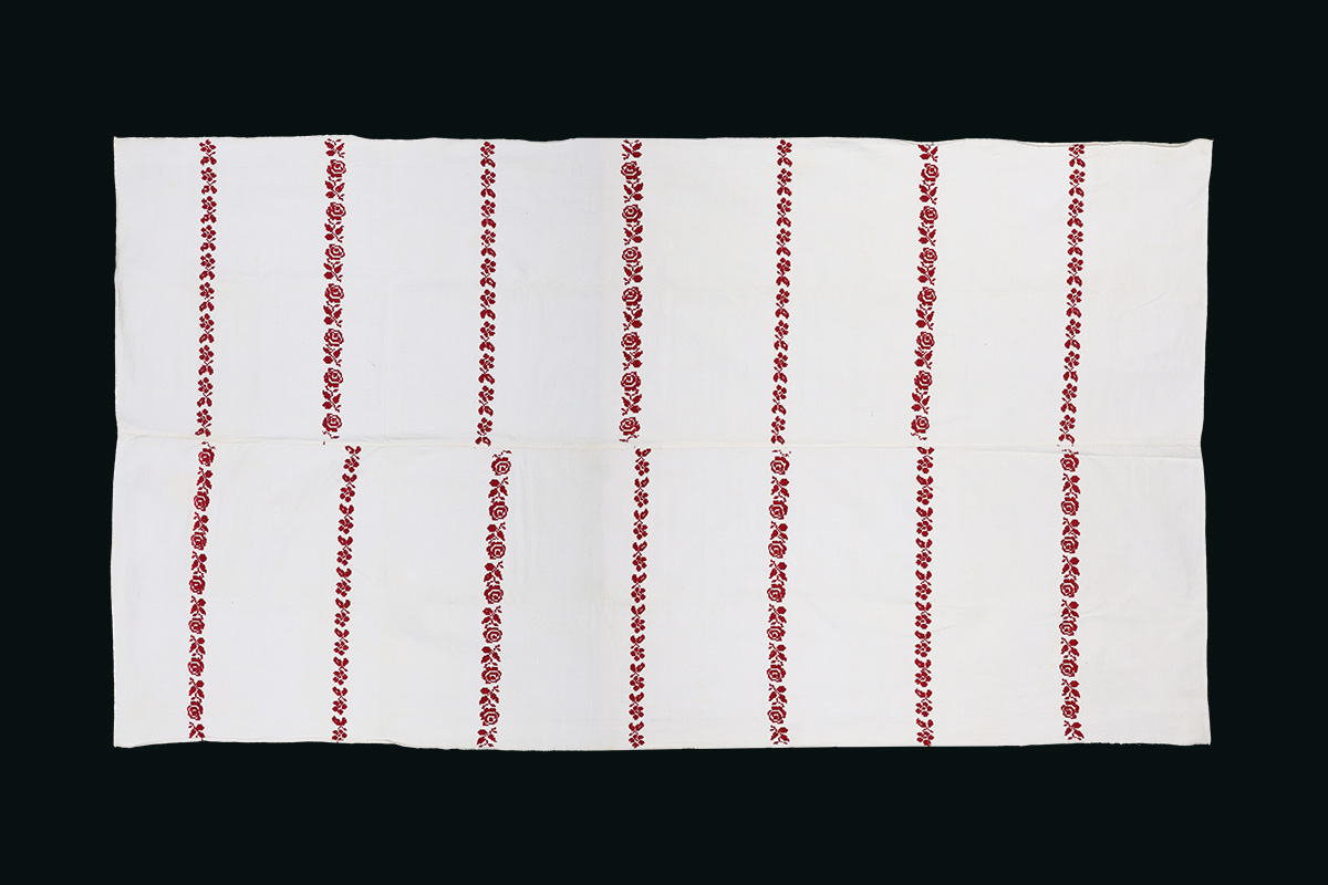 Descripton Plachta s rozmermi 210 cm × 116 cm je zhotovená z bieleho plátna zdobeného tkáčskou technikou nazývanou preberanie. Je to spôsob tkania, pri ktorom sa pracuje na jednej osnove s dvoma útkami. Jeden z nich tvorí základnú väzbu plátna a druhý, farebný, tvorí plastické ornamenty. To znamená, že červené nite, ktoré tvoria vzor, sa nachádzajú nad osnovnými niťami na povrchu tkaniny. Plachta je zhotovená z dvoch dielov, ktoré sú v strede zošité. General description Odevné plachty nosili ženy na ochranu pred vetrom alebo dažďom. V zime si nimi chránili kožuchy pred vlhkým snehom. Zahaľovali sa do nich viacerými spôsobmi. Zväčša ich nosili prehodené cez hlavu alebo plecia. V 2. štvrtine 20. storočia plachty v Slatinských Lazoch nahradili vlniaky. Odevná plachta slúžila aj ako bytový textil. Najčastejšie sa využívala ako obrus pri sviatočných príležitostiach a tiež na prenos nákladu alebo dieťaťa na chrbte. Work owner Chovancová, Anna (1941) Date of creation 1. polovica 20. storočia Municipality of origin Slatinské Lazy, okres Detva Recorded by Hronček, Lukáš (2000) Other responsibility Hronček, Lukáš (digitalizoval/-a)