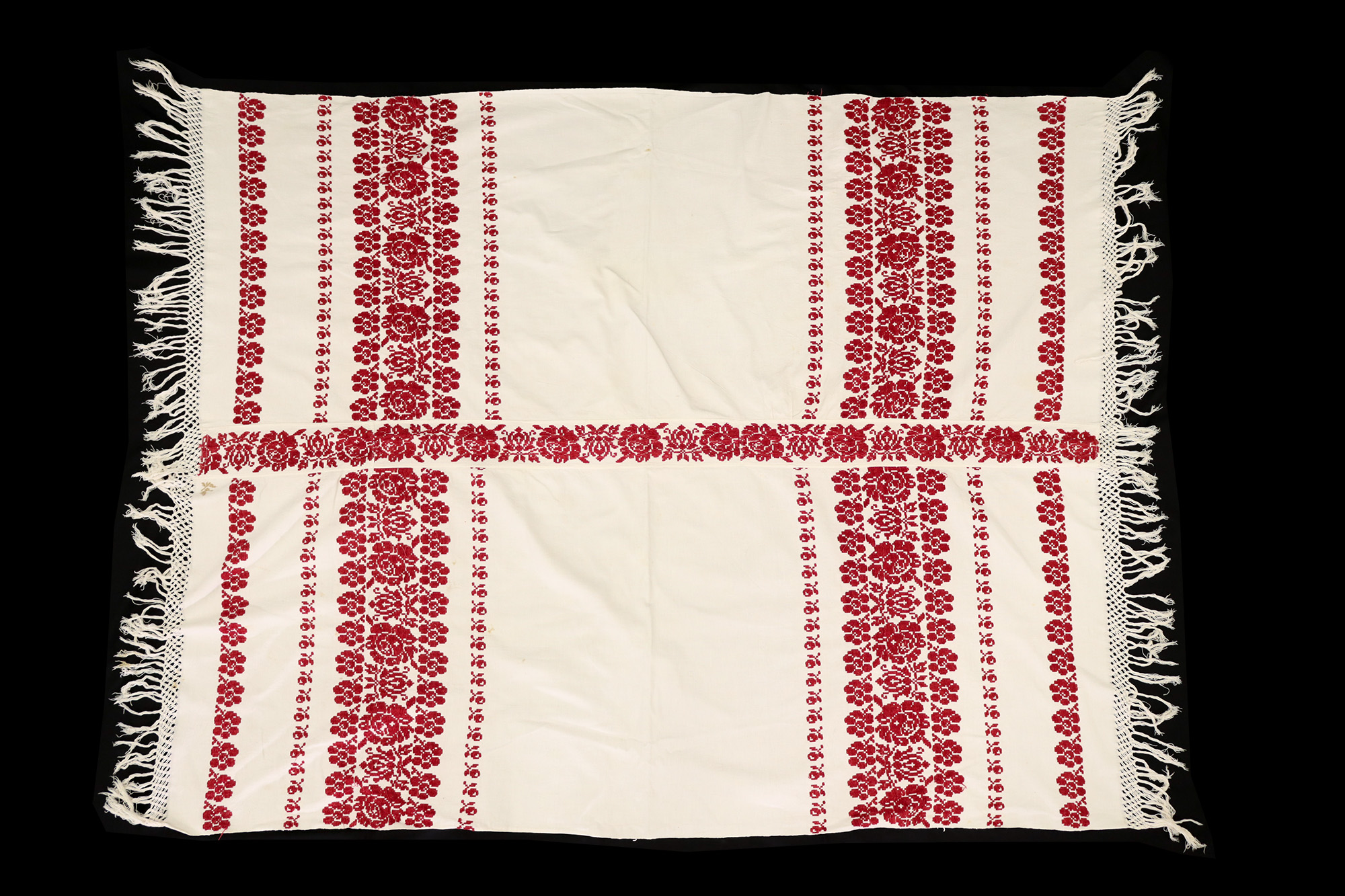 1. Descripton Plachta s rozmermi 154 cm × 130 cm je zhotovená z bieleho plátna zdobeného tkáčskou technikou nazývanou preberanie. Je to spôsob tkania, pri ktorom sa pracuje na jednej osnove s dvoma útkami. Jeden z nich tvorí základnú väzbu plátna a druhý, farebný, tvorí plastické ornamenty. To znamená, že červené nite, ktoré tvoria vzor, sa nachádzajú nad osnovnými niťami na povrchu tkaniny. Plachta je zhotovená z dvoch dielov, ktoré sú spojené vytkávaným pásom. Okraje sú na obidvoch stranách ukončené ručne viazanými strapcami s dĺžkou 13 cm.