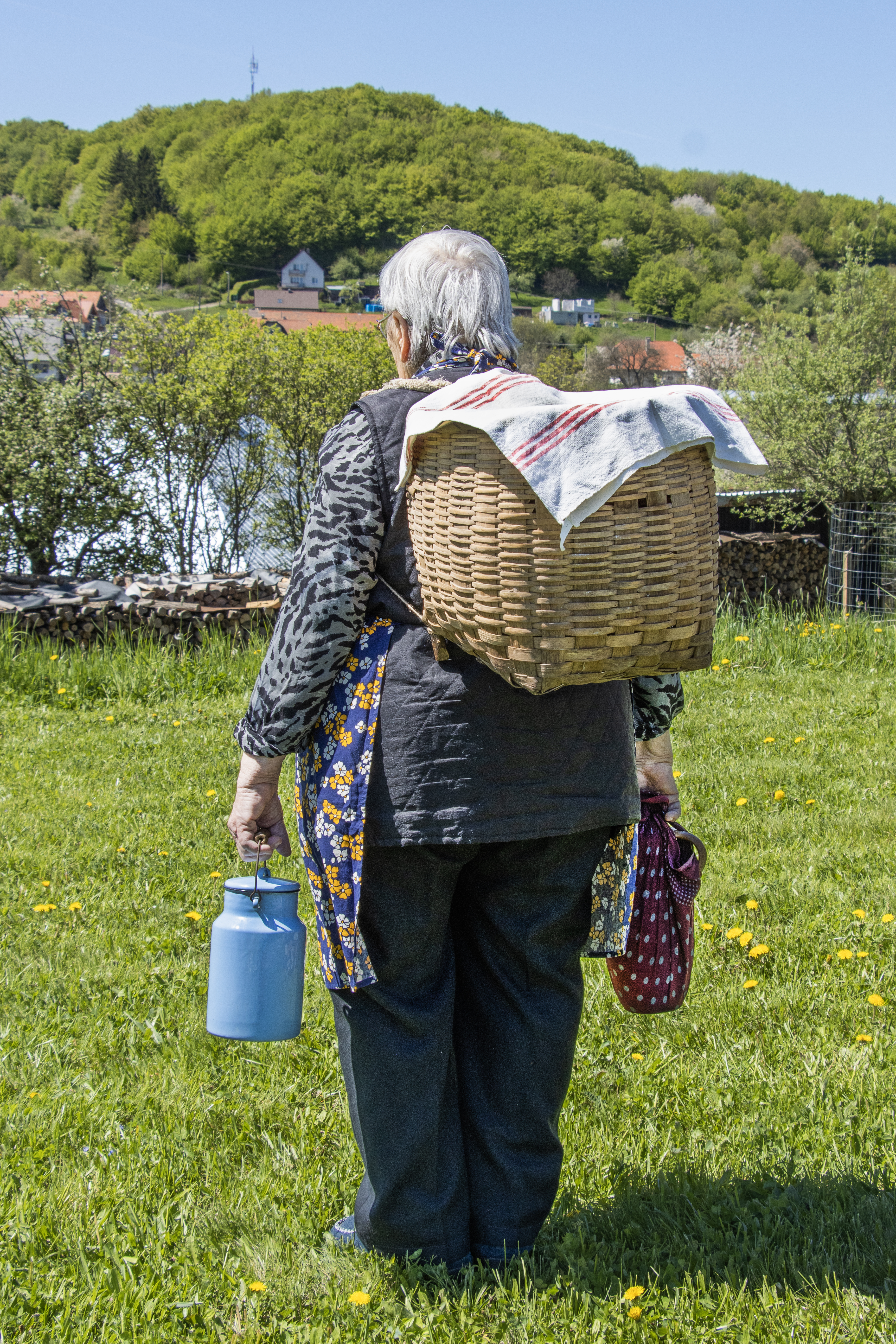2. fotografia dokumentujúca prenášanie stravy – rekonštrukciaGeneral description Obyvatelia obce Podhorie sa venovali prevažne poľnohospodárstvu. Pestovali poľnohospodárske plodiny, chovali dobytok a hydinu. Viacerí muži pracovali v lese pri ťažbe, spracovaní a zvážaní dreva. V takomto agrárnom prostredí sa strava počas celodenných prác prenášala na polia a lúky, ktoré boli od sídel vzdialené aj niekoľko kilometrov. Na transport stravy sa používali lubové koše, „plahotke“ – plátenné plachty, od druhej štvrtiny 20. storočia aj plechové kanvy. Na prenášanie kyslého mlieka alebo cmaru sa využívali hlinené mliečniky. Preväzovali sa špagátom alebo plátnom, aby sa dali pohodlnejšie preniesť. Note fotodokumentácia – rekonštrukcia Work owner obec Podhorie Municipality of origin Podhorie, okres Banská Štiavnica Recorded by Hronček, Lukáš (2000) Performers Ivaničová „Sitárová“, Anna (1934) Other responsibility Hronček, Lukáš (digitalizoval/-a)