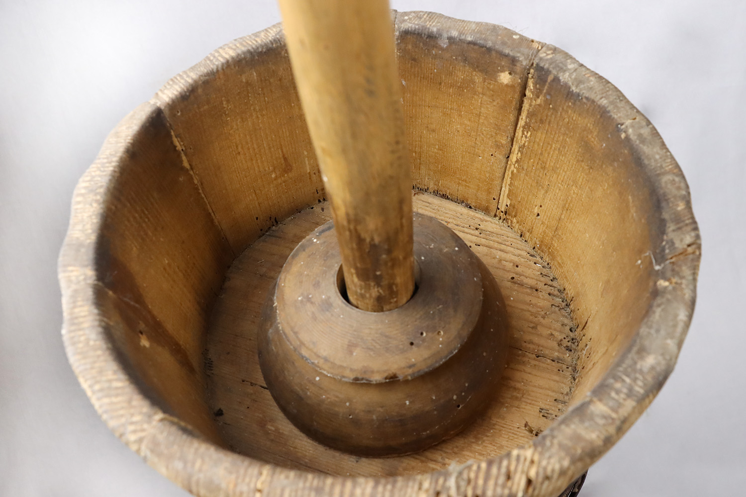 Descripton Drevená nádoba kužeľovitého tvaru je 52 cm vysoká, priemer otvoru je 19 cm, priemer dna je 24 cm. Piest je dlhý 114 cm. Drevené časti sú spojené kovovými obručami. Dbanka slúžila na mútenie masla. Note detailný pohľad Work owner Obec Sása Date of creation 1. štvrtina 20. storočia Municipality of origin Sása, okres Zvolen Recorded by Hronček, Lukáš (2000) Other responsibility Hronček, Lukáš (digitalizoval/-a)