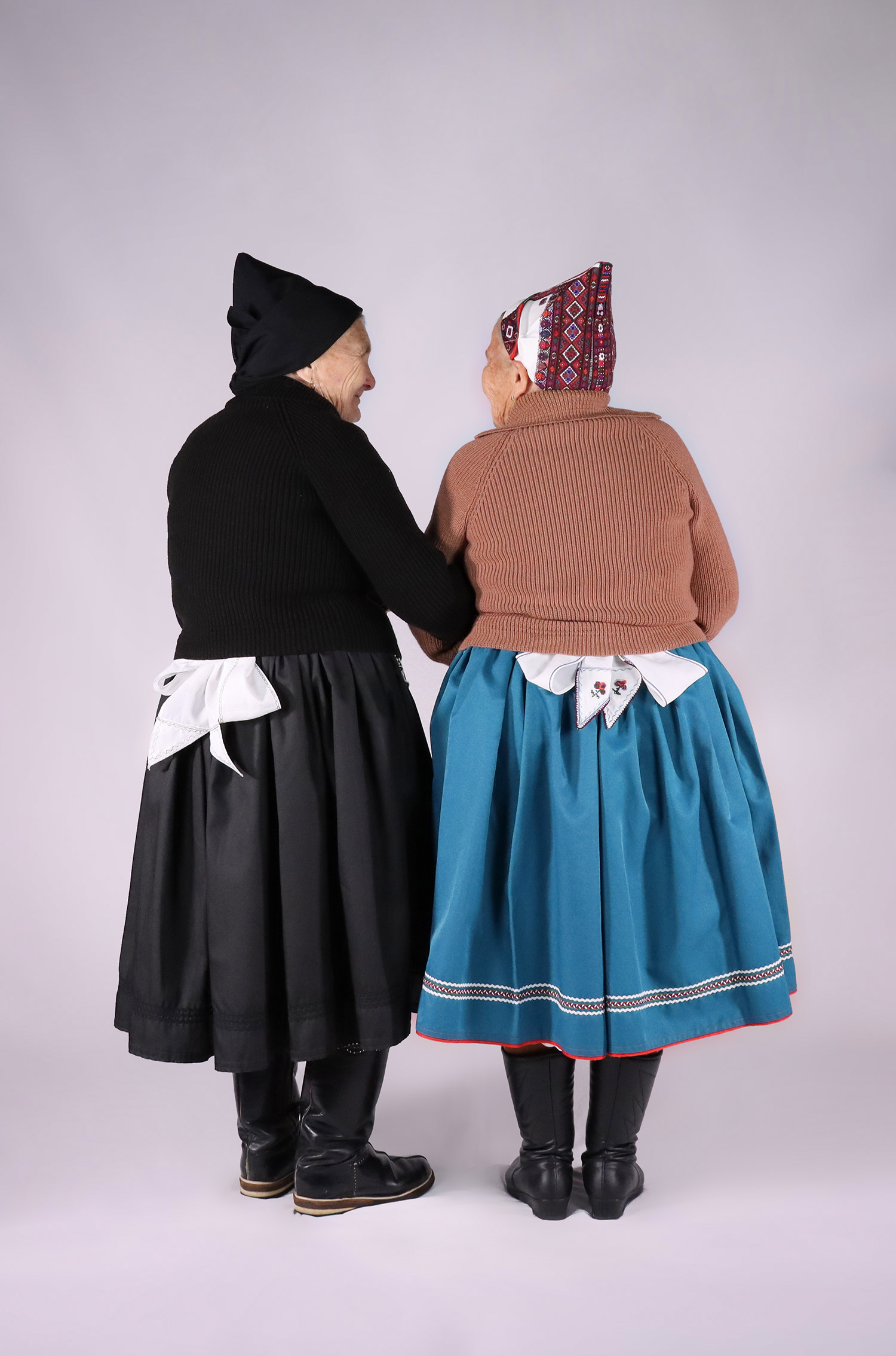 Obidve majú na nohách obuté „remenie“ – kožené čižmy. Doplnkom odevu je „zamaťik“ – ozdobná šnúrka alebo „patricki“ – koráliky uviazané okolo krku, ktoré obidve ženy nosia aj v domácom prostredí.Note celkový pohľad na polokroje zozadu Work owner Pohančaníková, Anna (1940)