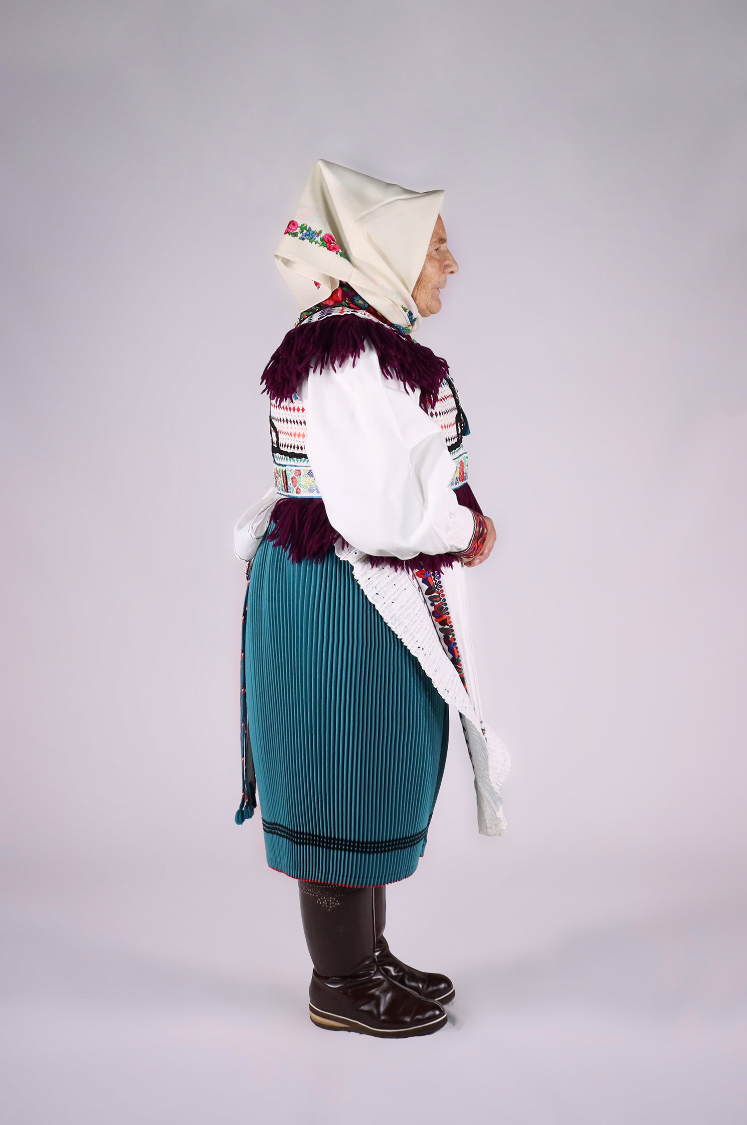 Popis Na fotografiách je zaznamenaný sviatočný odev, ktorý ženy nosili v nedeľu do kostola. Majiteľka a nositeľka odevu Emília Lihanová, narodená v roku 1945, ho nosievala do 90. rokov 20. storočia.