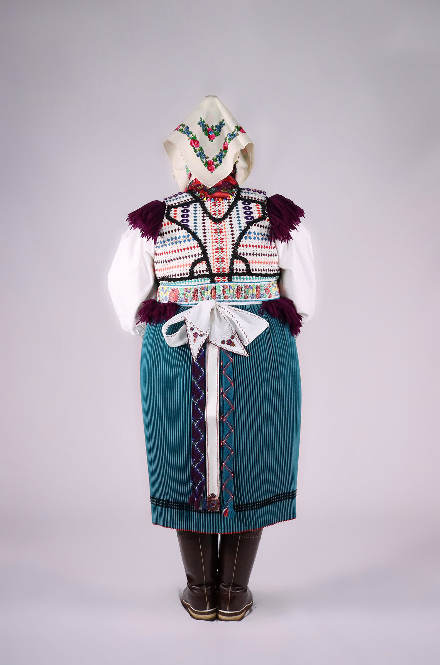 Popis Na fotografiách je zaznamenaný sviatočný odev, ktorý ženy nosili v nedeľu do kostola. Majiteľka a nositeľka odevu Emília Lihanová, narodená v roku 1945, ho nosievala do 90. rokov 20. storočia.