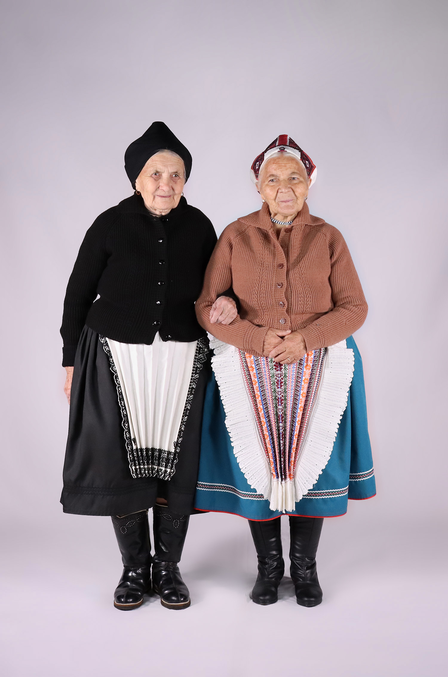 Obidve majú na nohách obuté „remenie“ – kožené čižmy. Doplnkom odevu je „zamaťik“ – ozdobná šnúrka alebo „patricki“ – koráliky uviazané okolo krku, ktoré obidve ženy nosia aj v domácom prostredí.