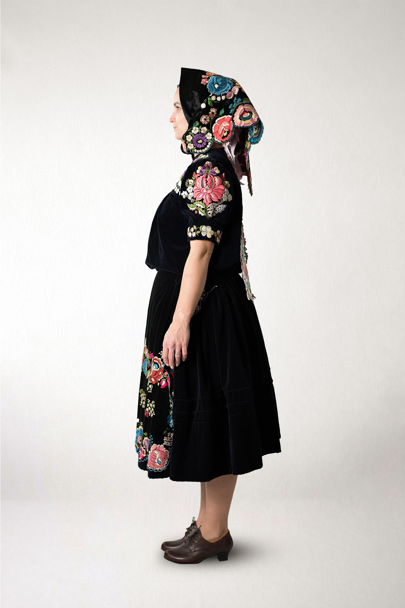 1. Popis Na fotografiách je zaznamenaný ženský sviatočný odev z Detvy datovaný do 50. rokov 20. storočia. Nosili ho ženy v mladšom veku na sviatočné príležitosti. Ide o polokroj – prechodnú formu medzi tradičným a mestským odevom. Tvorí ho: vrchná sukňa, dve spodné sukne, zástera, blúza a spodný odev. Sukňa je zhotovená zo zamatu. Pod vrchnú sukňu sa obliekali dve až tri spodné plátenné sukne. Zamatová zástera je vyšívaná plným plochým stehom hodvábnou niťou. Ide o „jednopolovú“ zásteru – ušitú z jedného dielu – 60 cm širokú, ktorá bola módna v polovici 20. storočia. Zamatová blúza sa vzadu zapína na malý gombík. Pod krkom a na rukávoch je vyšívaná plným plochým stehom hodvábnou niťou. Spodný odev tvorí plátenná košieľka bez rukávov, ktorá siaha po kolená. Doplnkom odevu je „ľimbačková kápka“ – čepiec vyšívaný korálikmi a zamatová šatka vyšívaná plným plochým stehom hodvábnou niťou. „Šnúrka“, ktorá sa uväzovala na zátylku čepca, je vyšitá „krivou ihlou“ a vyrezávaná. Žena má obuté poltopánky.