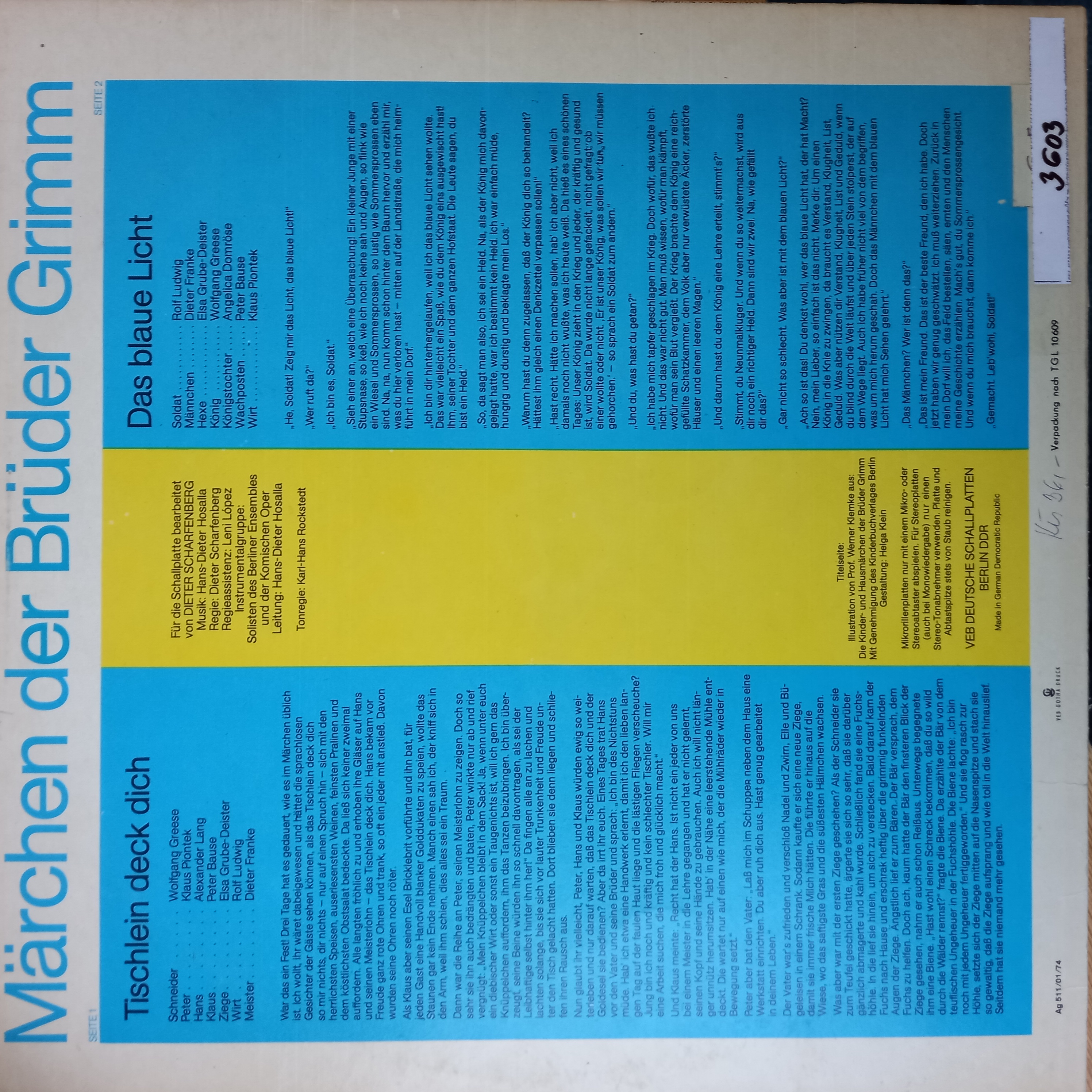 Title Tischlein deck dich Das blaue Licht zvukový záznam Author info Jacob Grimm, Wilhelm Grimm Author Grimm Jacob 1785-1863 Co-authors Grimm Wilhelm 1786-1859 Issue data NDR : Litera , 1974. - 1 platňa, 31x31 cm Document kind JGP Language German Country Germany systematics 0.G-5 Database xkni - BOOKS Copy count 1, currently available 0, at library only 1 Call number Track No. Location Sublocation Info A 003603 003603 Knižnica Ružinov Bratislava Na úvrati In-Library Use Only