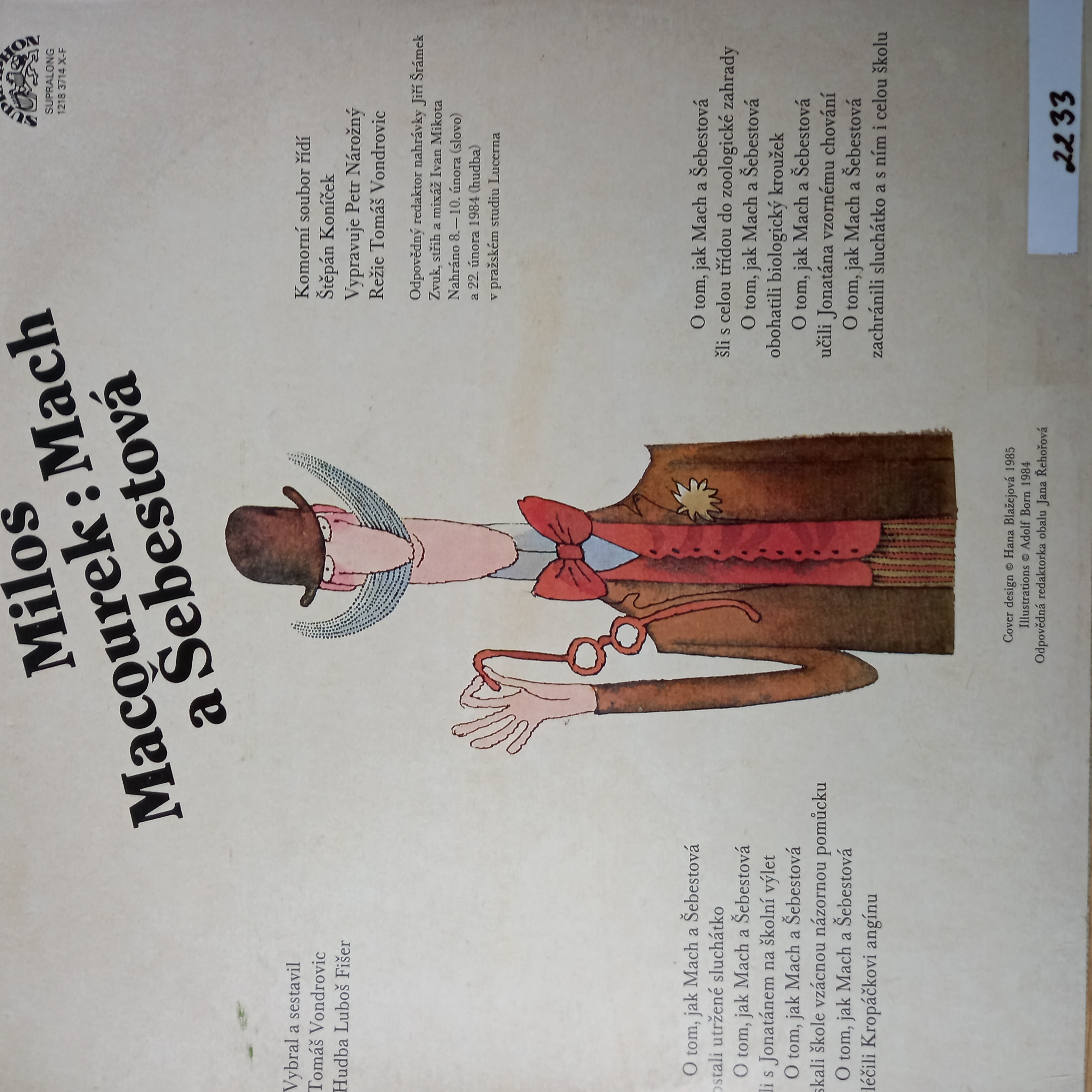 Názov Mach a Šebestová zvukový záznam Aut.údaje Miloš Macourek Autor Macourek Miloš 1926-2002 Vyd.údaje Praha : Supraphon , 1985. - 1 platňa, 31x31 cm Druh dok. JGP Jazyk dok. čeština Krajina -CS Báza dát xkni - KNIHY Počet ex. 1, z toho voľných 0, prezenčne 1 Signatúra Prír.číslo Lokácia Dislokácia Info A 002233 002233 Knižnica Ružinov Bratislava Na úvrati len prezenčne