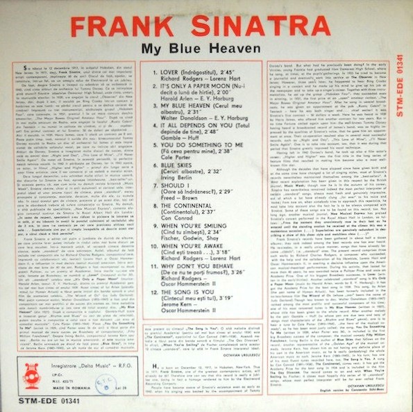 Title My Blue Heaven zvukový záznam Author info Frank Sinatra Author Sinatra Frank Issue data Rumunsko : Electrecord , [1977]. - 1 platňa, 31x31 cm Document kind JGP Language English Country Romania Database xkni - BOOKS Copy count 3, currently available 0, at library only 3 Call number Track No. Location Sublocation Info A 004951 004951 Knižnica Ružinov Bratislava Na úvrati In-Library Use Only A 004952 004952 Knižnica Ružinov Bratislava Na úvrati In-Library Use Only A 004950 004950 Knižnica Ružinov Bratislava Na úvrati In-Library Use Only