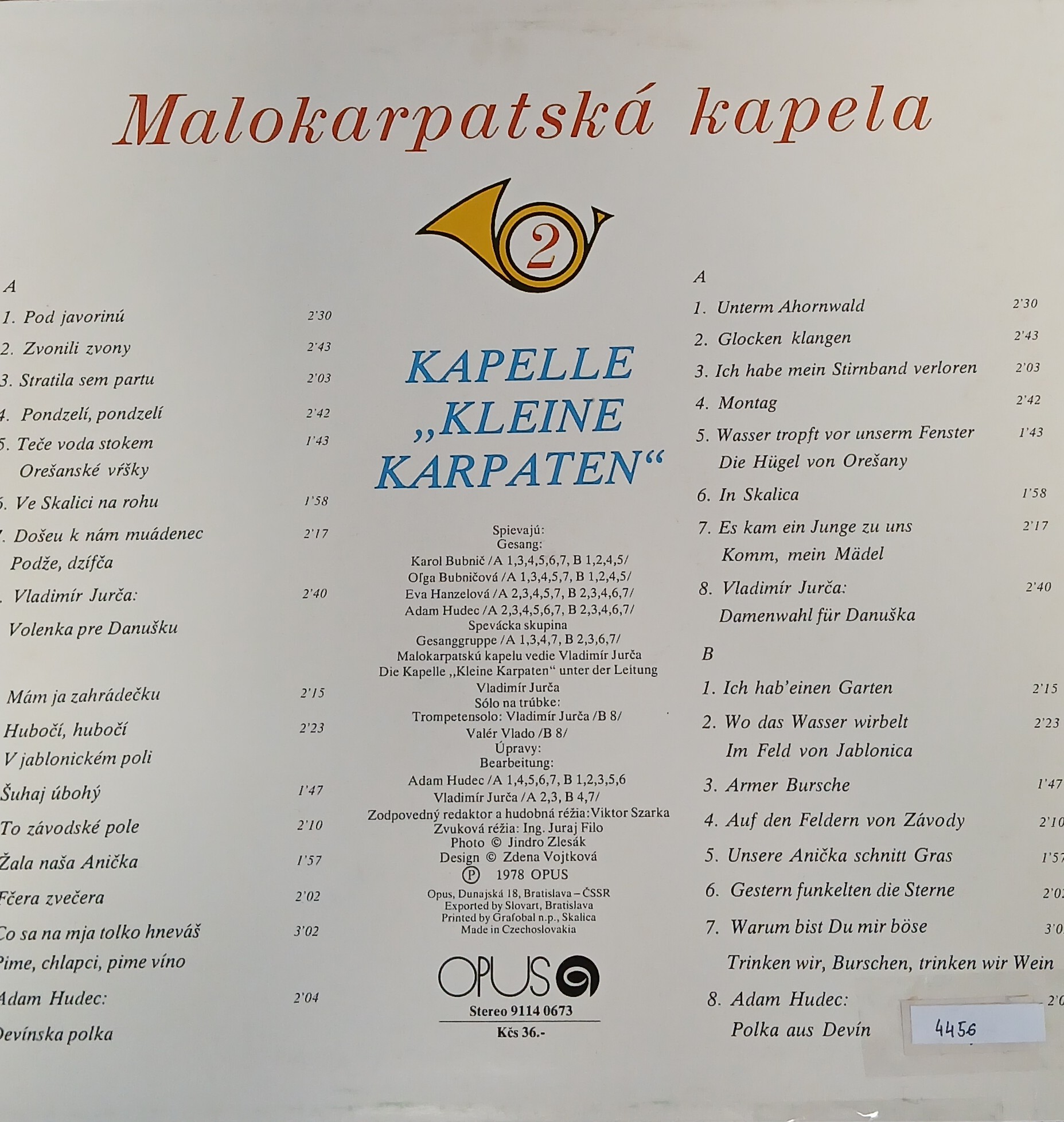 Title Malokarpatská kapela 2 zvukový záznam Author info Malokarpatská kapela Author Malokarpatská kapela Issue data Bratislava : Opus , 1978. - 1 platňa, 31x31 cm Document kind JGP Language Slovak Country Slovak Republic Database xkni - BOOKS Copy count 1, currently available 0, at library only 1 Call number Track No. Location Sublocation Info A 004456 004456 Knižnica Ružinov Bratislava Na úvrati In-Library Use Only