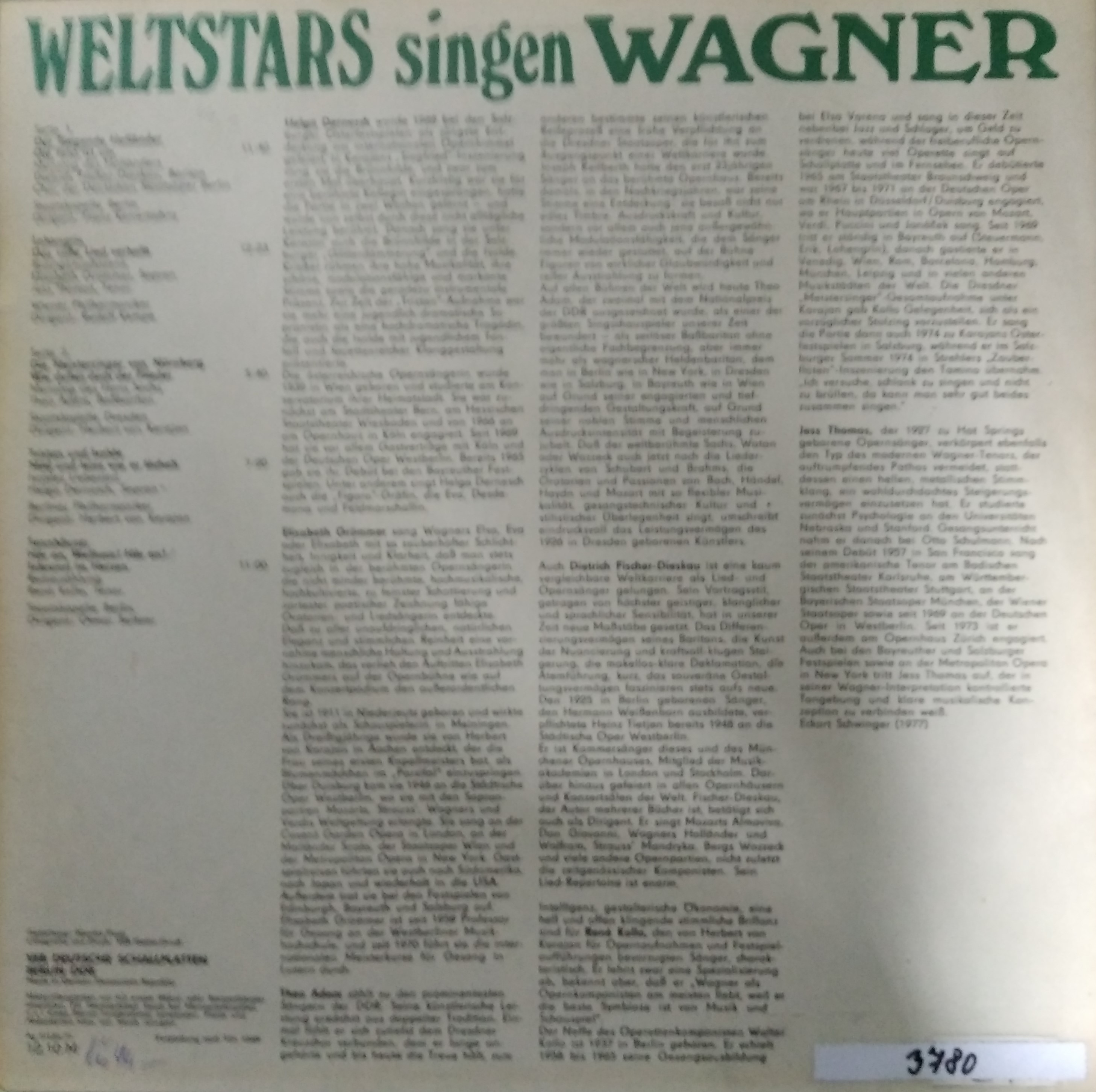 Title Weltstars singen Wagner zvukový záznam Author info Richard Wagner Author Wagner Richard 1813-1883 Issue data NDR : Eterna , 1977. - 1 platňa, 31x31 cm Document kind JGP Language German Country Germany Database xkni - BOOKS Copy count 1, currently available 0, at library only 1 Call number Track No. Location Sublocation Info A 003780 003780 Knižnica Ružinov Bratislava Na úvrati In-Library Use Only