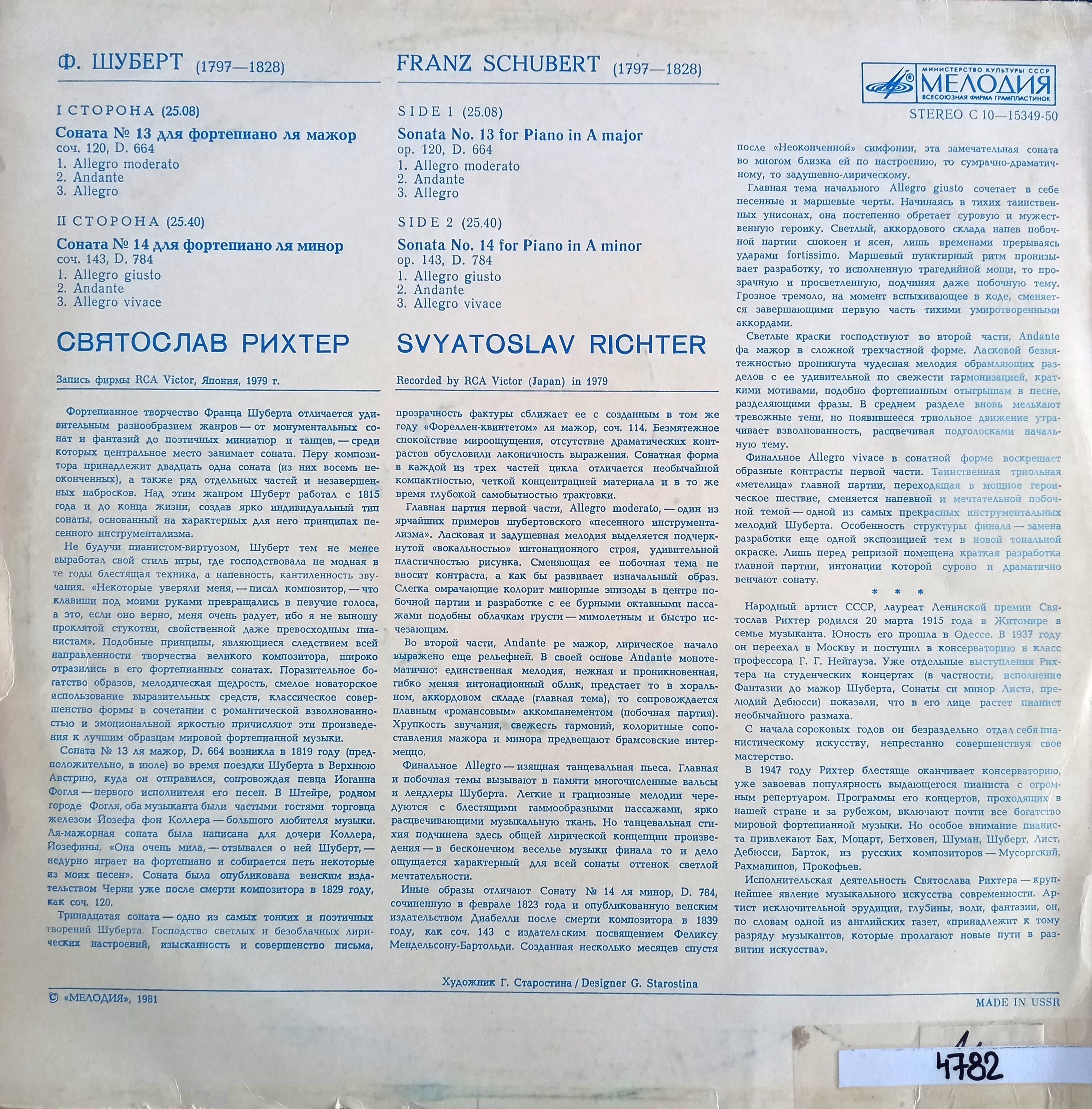 Title Sonata No 13 dlja fortepiano Sonata No 14 dlja fortepiano zvukový záznam Author info Franz Schubert Author Schubert Franz 1797-1828 Issue data ZSSR : Melodija , 1981. - 1 platňa, 31x31 cm Document kind JGP Language Russian Country Russian Federation Database xkni - BOOKS Copy count 1, currently available 0, at library only 1 Call number Track No. Location Sublocation Info A 004782 004782 Knižnica Ružinov Bratislava Na úvrati In-Library Use Only
