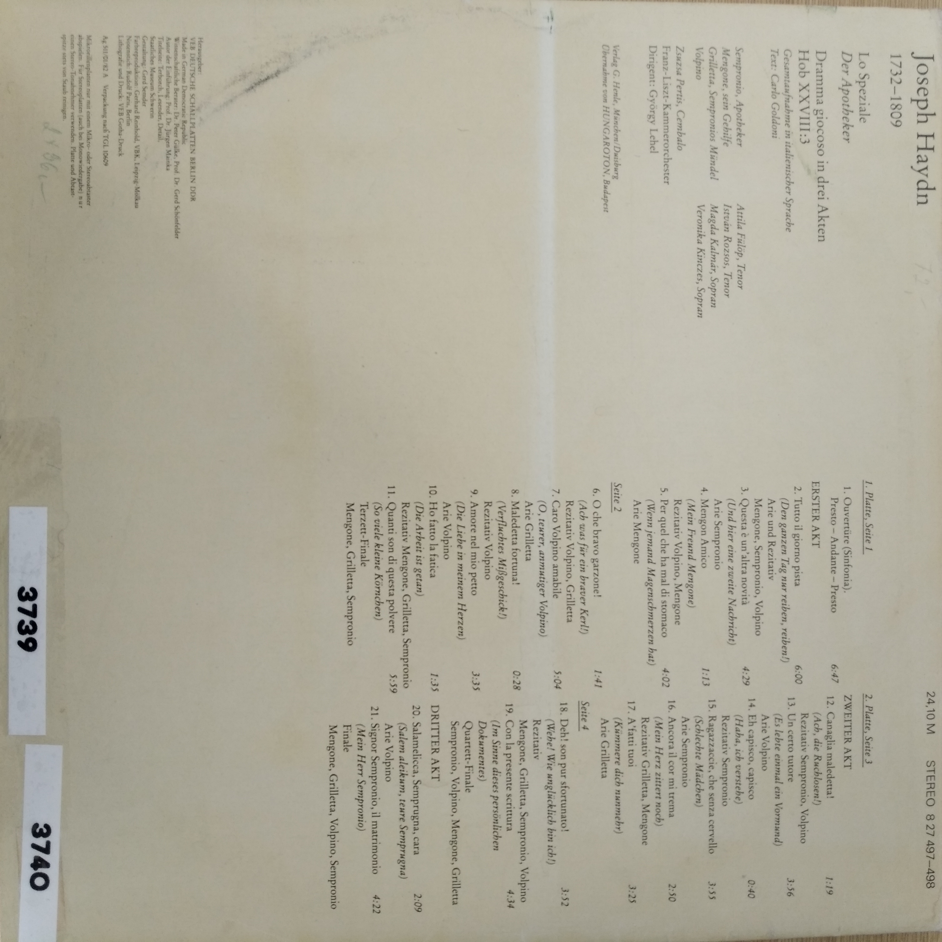 Názov Lo Speziale zvukový záznam Aut.údaje Joseph Haydn Autor Haydn Joseph 1732-1809 Vyd.údaje NDR : Eterna , 1982. - 2 platne, 31x31 cm Druh dok. JGP Jazyk dok. nemčina Krajina Nemecko Báza dát xkni - KNIHY Počet ex. 2, z toho voľných 0, prezenčne 2 Signatúra Prír.číslo Lokácia Dislokácia Info A 003739 003739 Knižnica Ružinov Bratislava Na úvrati len prezenčne A 003740 003740 Knižnica Ružinov Bratislava Na úvrati len prezenčne