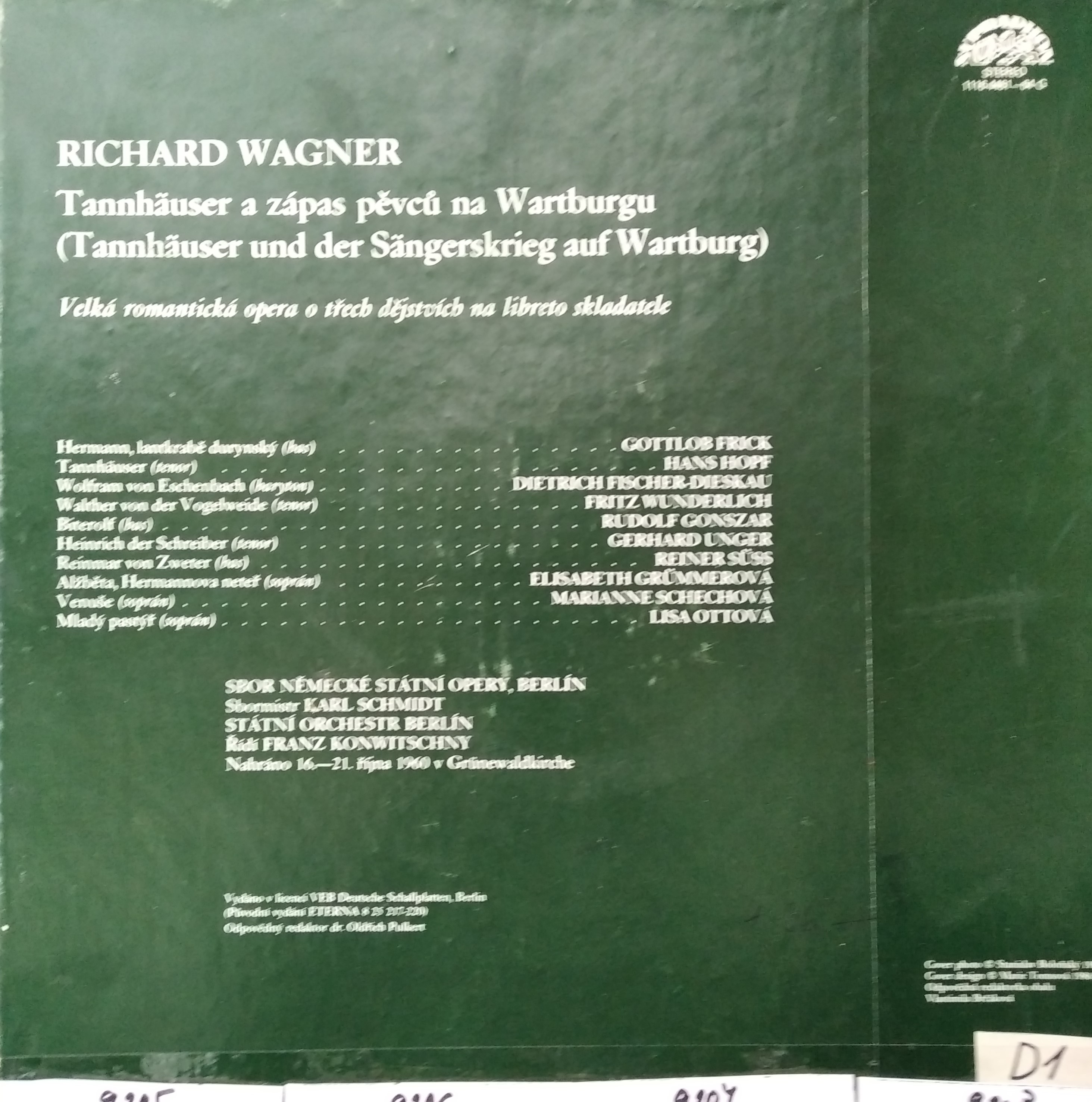 Názov Tannhäuser a zápas pěvců na Wartburgu zvukový záznam Aut.údaje Richard Wagner Autor Wagner Richard Vyd.údaje Praha : Supraphon , 1986. - 4 platne, 31x31 cm + 1 vlož. príl. Druh dok. JGP Jazyk dok. čeština Krajina -CS Báza dát xkni - KNIHY Počet ex. 4, z toho voľných 0, prezenčne 4 Signatúra Prír.číslo Lokácia Dislokácia Info A 009205 009205 Knižnica Ružinov Bratislava Na úvrati len prezenčne A 009206 009206 Knižnica Ružinov Bratislava Na úvrati len prezenčne A 009207 009207 Knižnica Ružinov Bratislava Na úvrati len prezenčne A 009208 009208 Knižnica Ružinov Bratislava Na úvrati len prezenčne