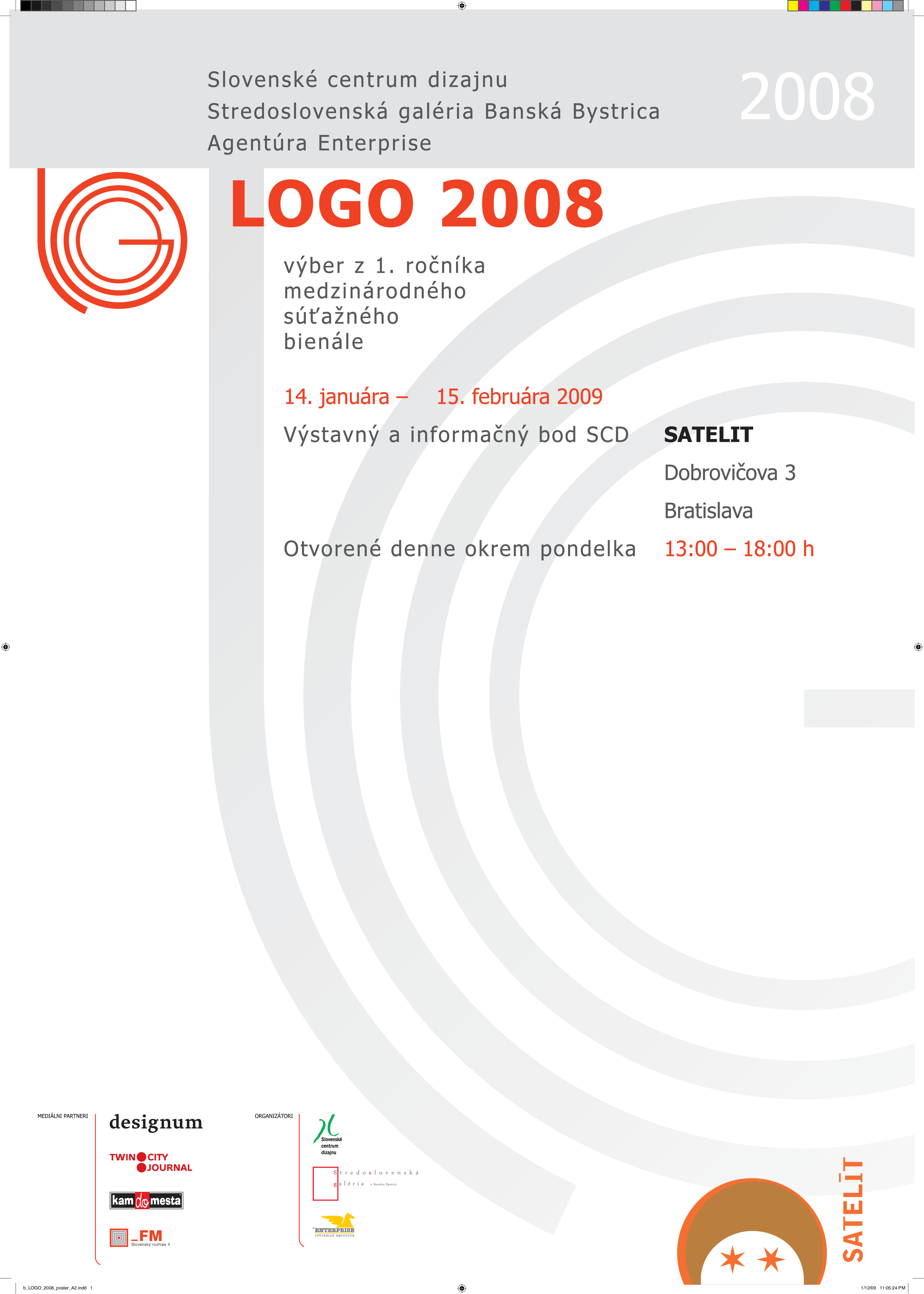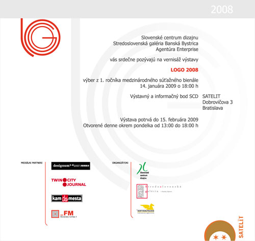 Poznámka Slovenské centrum dizajnu predstavuje vo svojom výstavnom a informačnom bode Satelit výber logotypov z 1. ročníka medzinárodnej súťaže LOGO 2008, ktorú jej organizátori – Stredoslovenská galéria v Banskej Bystrici a agentúra Enterprise – prezentovali v celej šírke na výstave v Banskej Bystrici koncom roka 2008. Bratislavská výstava obsahuje podstatnú časť z kolekcie 90 log od 35 domácich a zahraničných profesionálov - dizajnérov z Českej republiky, Grécka, Portugalska, Talianska a Veľkej Británie. Zvláštnou kategóriou sú návrhy vytvorené študentmi slovenských a českých umeleckých škôl. Osobitná pozornosť je venovaná oceneným logám v dvoch kategóriách – profesionálov a študentov. Súťaž LOGO sa bude organizovať každé dva roky a jej cieľom je spoznať najlepšie výsledky v tvorbe loga na medzinárodnej úrovni a porovnať ich s domácou tvorbou. Logotyp je základný prvok vizuálnej komunikácie a v súčasnosti je predmetom veľkého záujmu spoločností a firiem, ktorým pomáha prezentovať sa upozorňovať na seba. Konfrontácia slovenského a zahraničného grafického dizajnu je výzvou pre domácich tvorcov na reflexiu, výskum a zvýšenie úrovne nových log. K súťaži bol vydaný dvojjazyčný katalóg. Báza dát Satelit