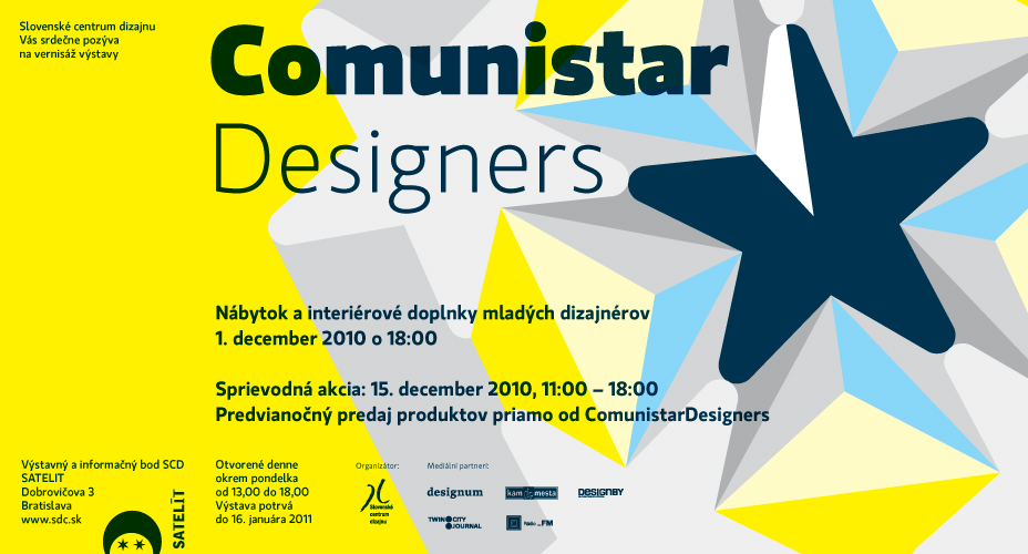 Poznámka Slovenské centrum dizajnu predstavuje tvorbu trojice dizajnérov prezentujúcich sa pod značkou ComunistarDesigners. Založili ju absolventi ateliéru produkt dizajnu prof. Františka Buriana bratislavskej VŠVU - Roman Ficek, Peter Jakubík a Marián Laššák. Ide o prvú samostatnú prezentáciu skupiny, ktorá sa sformovala v roku 2007. Výstava ukazuje prierez ich doterajšou tvorbou, ktorá je zameraná na dizajn nábytku, bytové doplnky a drobné úžitkové predmety. ComunistarDesigners sa profilujú ako tvorcovia autorského dizajnu s presahmi do voľnej tvorby a dôrazom na konceptuálny rozmer v dizajne. ComunistarDesigners sú: Roman Ficek (*1981) absolvoval Strednú školu úžitkového výtvarníctva v Kremnici a Vysokú školu výtvarných umení v Bratislave so zameraním na dizajn výrobkov. Počas tretieho ročníka bol na bakalárskom štipendijnom pobyte v Británii, na univerzite v Exeteri Plymouthu. Krátko po štúdiách sa stal jedným zo zakladateľov dizajnérskeho štúdia Comunistar Designers. V súčasnosti sa venuje nábytkovému a interiérovému dizajnu. Petr Jakubík (*1979) vyštudoval Vysokú školu výtvarných umení a dizajnu v Bratislave. Počas školy absolvoval študijný pobyt na Ecole Supérieure d'Art et Design de Saint-Etienne. Je spoluzakladatelom Comunistar Designers. Kombinuje talent provokovať nápadmi s vášňou pre pikantné podrobnosti. Marián Laššák (*1979) študoval na Strednej priemyselnej škole drevárskej vo Zvolene, odbor konštrukcia a tvorba nábytku. Vo svojom štúdiu pokračoval na Fakulte Architektúry STU v Bratislave, ústave dizajnu a štúdium ukončil na Vysokej škole výtvarných umení v Bratislave, katedre dizajnu. Venuje sa tvorbe nábytku a vystavuje na mnohých výstavách. Báza dát Satelit